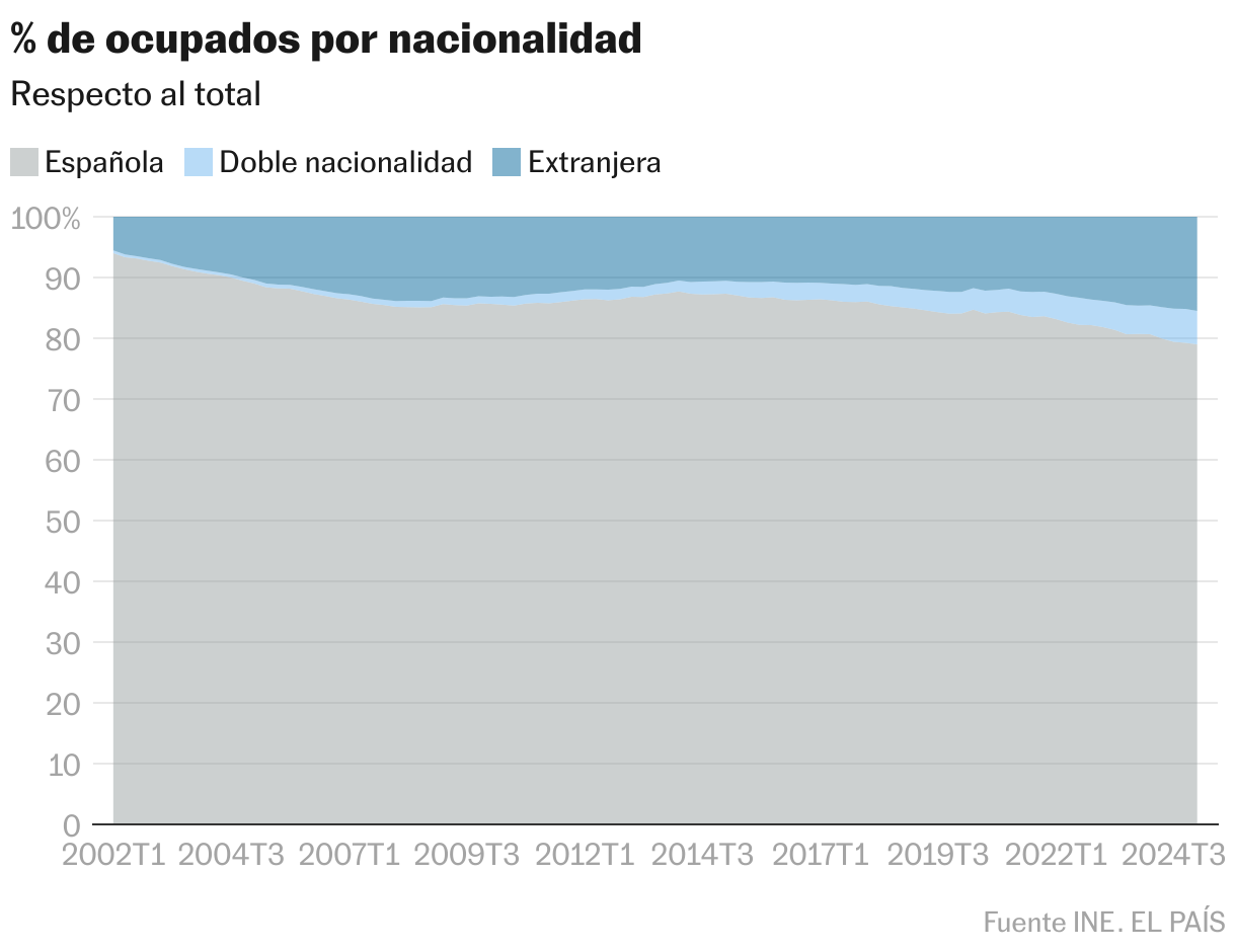La estadística del INE sirve para radiografiar otro fenómeno clave y que no captura la afiliación, el acelerón del número de empleados con doble nacionalidad. Se han duplicado desde 2019, cuando eran 633.000, frente a los 1,2 millones del primer trimestre de 2025. En el mismo periodo, según el INE, el número de extranjeros ocupados pasa de 2,31 millones a 3,37 y el de aquellos solo con nacionalidad española, de 19,47 millones a 21,76. Así, este grupo representa el 79% del total, el mínimo desde que hay registros, cinco puntos menos que antes de la pandemia y diez menos que hace dos décadas. Los extranjeros son el 15,5% y los de doble nacionalidad, el 5,5%.