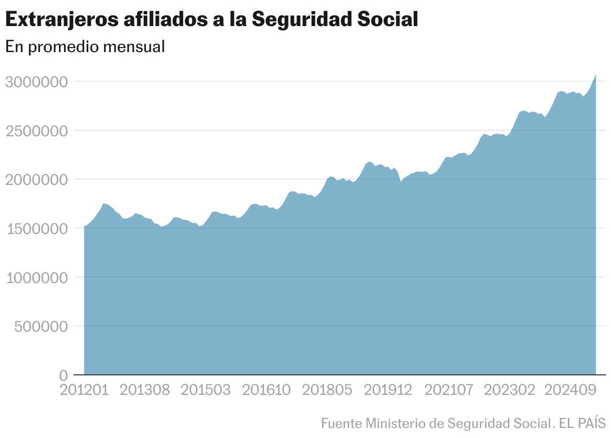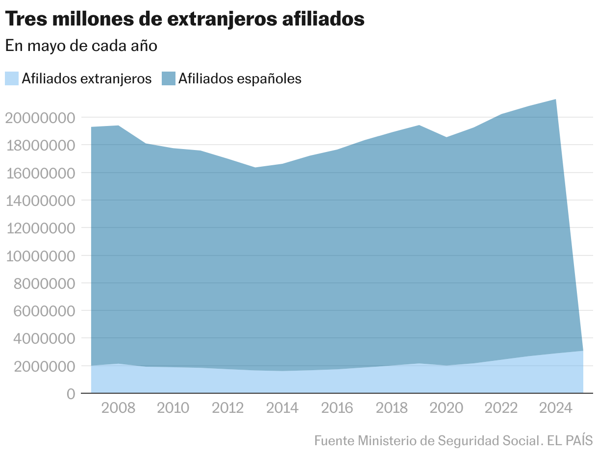 Por primera vez desde que hay registros España supera los tres millones de extranjeros afiliados a la Seguridad Social. Son 3.070.831 personas, el 14% del total de afiliados (21,78 millones), según los datos correspondientes a mayo que ha distribuido el ministerio de Elma Saiz. Es un hito más en el creciente protagonismo de esta comunidad en la fuerza laboral española, clave en la evolución positiva del empleo en los últimos años: del medio millón de puestos creados en 2024, 212.000 correspondieron a los afiliados extranjeros. Es decir, un grupo que representa al 14% de los trabajadores aporta cuatro de cada diez nuevos empleos.