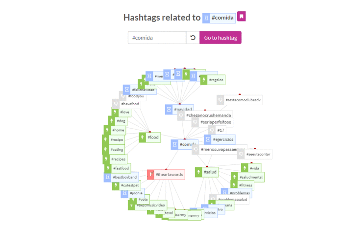 También nos dice aquellos que no recomienda usar por ser muy populares o por no tener muchos seguidores, igualmente, crea una red con los hashtags relacionados, similar a DisplayPurposes.