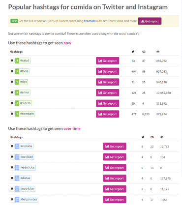 Esta herramienta propone varios hashtags alternativos a partir de una palabra clave y los ordena en función de la relevancia.