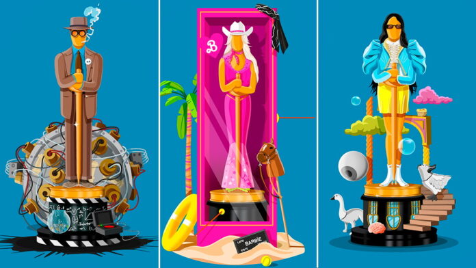 En su singular homenaje que ha causado revuelo en las redes sociales, el artista británico reimagina la estatuilla dorada que honra a los ganadores de los Premios de la Academia, cubriendo este precioso trofeo con abundante Referencias a las películas que compiten en la categoría de Mejor Largometraje este año.