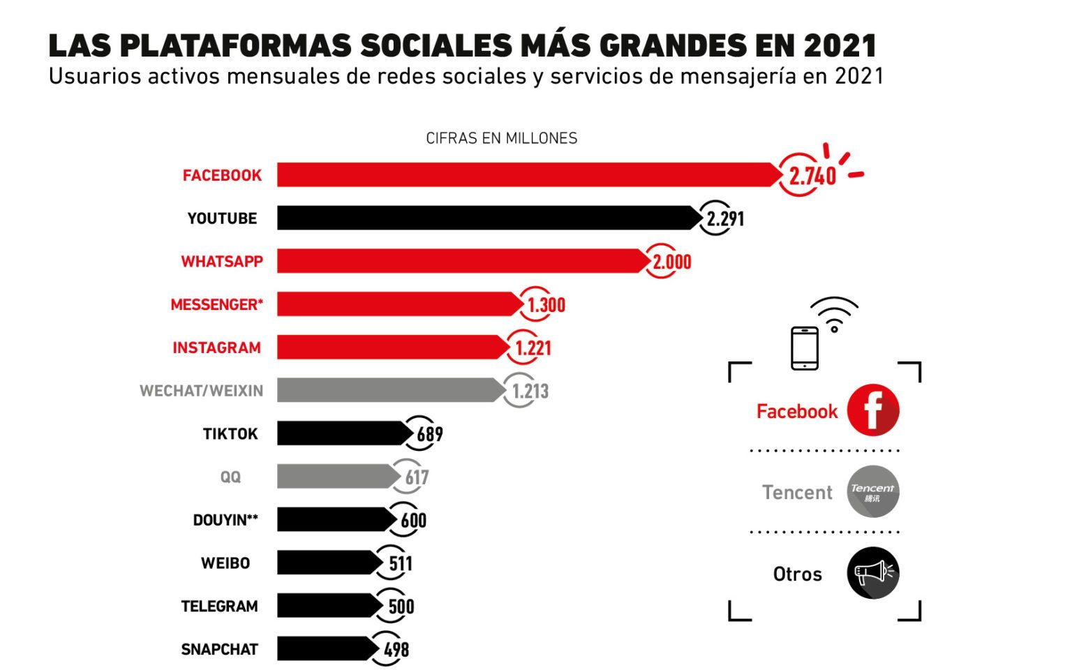 Facebook llega por los casi 3 mil millones de usuarios activos mensuales que está por alcanzar, una cifra que sin duda contrasta de forma importante con otras redes sociales.