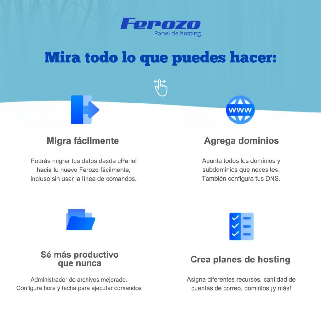 Aunque se conoce que Ferozo fue creado hace 16 años, es ahora cuando tiene su gran apogeo, debido a la gran disponibilidad que ofrece en toda Latinoamérica. En la actualidad tiene alrededor de 200 mil hostings trabajando con su panel. Un gran beneficio que ofrece esta herramienta es la cantidad de hostings que se pueden administrar, pues a diferencia de otros servicios que ofrecen un limitado número de hostings, Ferozo no pone límites. Esto quiere decir que la cantidad de hostings que puedes administrar es infinita. Entre lo que ofrece Ferozo se encuentra la administración de dominios, subdominios, bases de datos, cuentas FTP, entre otros.