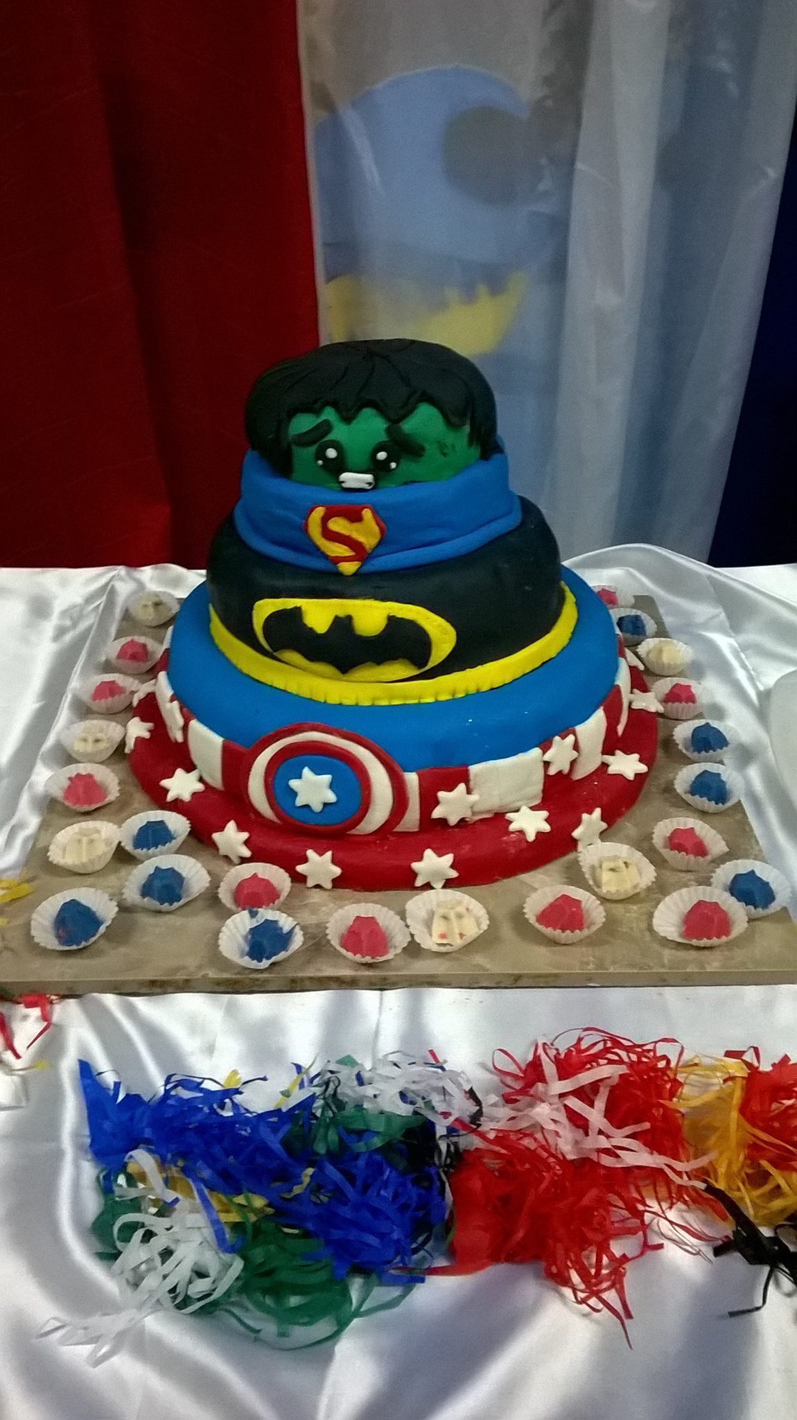 Torta cubierta de Fondam, temática de superhéroes. Foto de GuayaCake.
