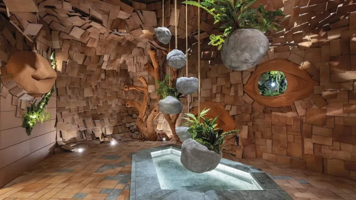 Otra propuesta que honra los sentidos es la de Espacio grupal de Gresmancorganizado estudiando Fran Cisneros Landschaftsbau. La conexión entre el ser humano y la naturaleza configura el núcleo de esta propuesta. Entre las paredes y el Techo Piezas superpuestas cubiertas que imitan la corteza de un árbol, los labios de arcilla, un ojo iluminado que muestra la vegetación en el otro lado. A estanque central que respira en el que flotas en las plantas colgantesEso parece navegar en pequeñas rocas. El conjunto respira esta fusión como un todo orgánico y esencial.