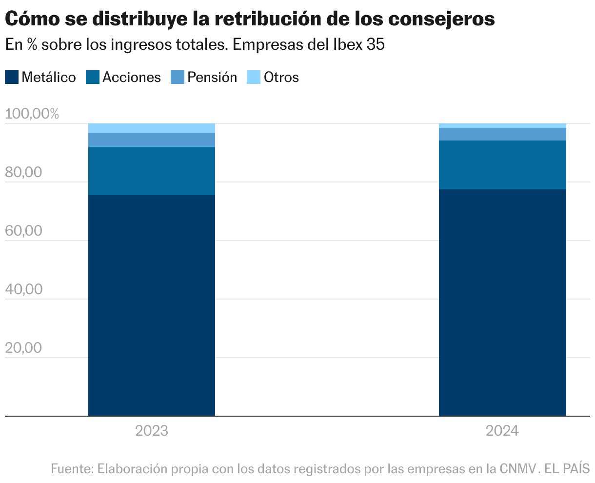 A diferencia de todos los manuales de gobierno corporativo, las empresas españolas continúan pagando la mayor parte del salario de sus miembros del Consejo de Caza (77.51% de la remuneración total en 2024); El pago en acciones solo condujo al 16.62%, la pensión 4.15%y la categoría de otros pagos (automóvil, seguro, espacio vital) 1.72%.