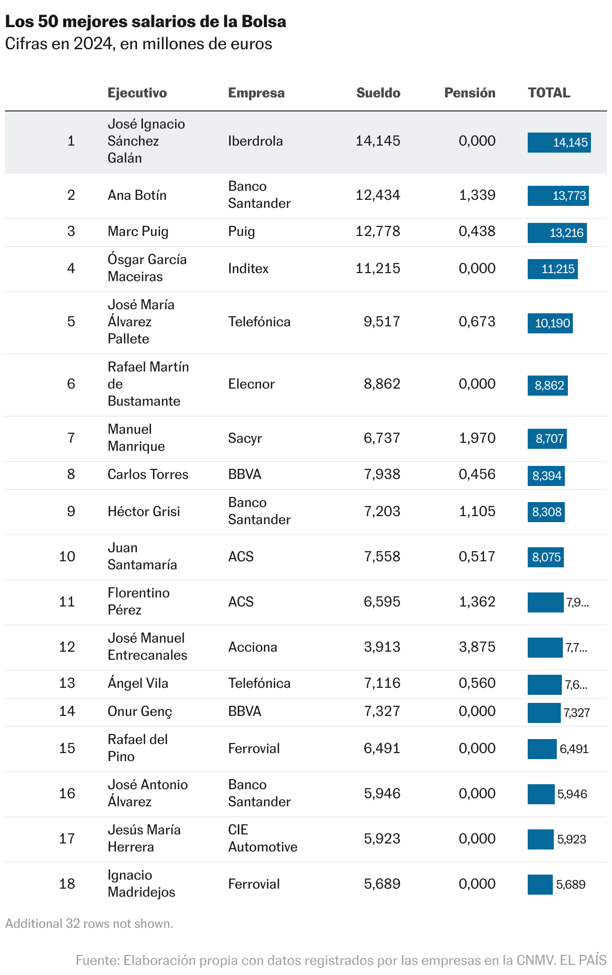 Después de Prosegur, la próxima mayoría de la compañía regresó a Prosegur en 2024. El fabricante de automóviles pagó 5,9 millones de euros A su CEO, Jesús María HerreraEsto significa que los 19,000 euros, que su plantilla recibió en promedio, se multiplican por 312 veces. El tercer lugar era un nombre común en este ranking: Inditex. El CEO del gigante textil, Óscar García Maceiras, recibió una remuneración de 11.21 millones de euros, es decir, 295, más que los 38,000 euros que sus trabajadores han ganado en promedio. Banco Santander también tenía una notable brecha salarial. Ana Botín, presidenta de la compañía, recibió 13.77 millones entre el salario y la pensión, 226 más que los empleados bancarios. Un ascenso brillante en la lista de desigualdad fue el que tenía Puig. El grupo de perfume publicado hace un año, que se pagó a Marc Puig, su presidente con 13.21 millones, corresponde a la declaración salarial anual de los empleados. El gerente mejor pagado en toda la bolsa de valores fue el presidente de Iberdrola, Ignacio Sánchez Galán, quien recibió un total de 14.14 millones de euros, 168, más que su fuerza laboral.