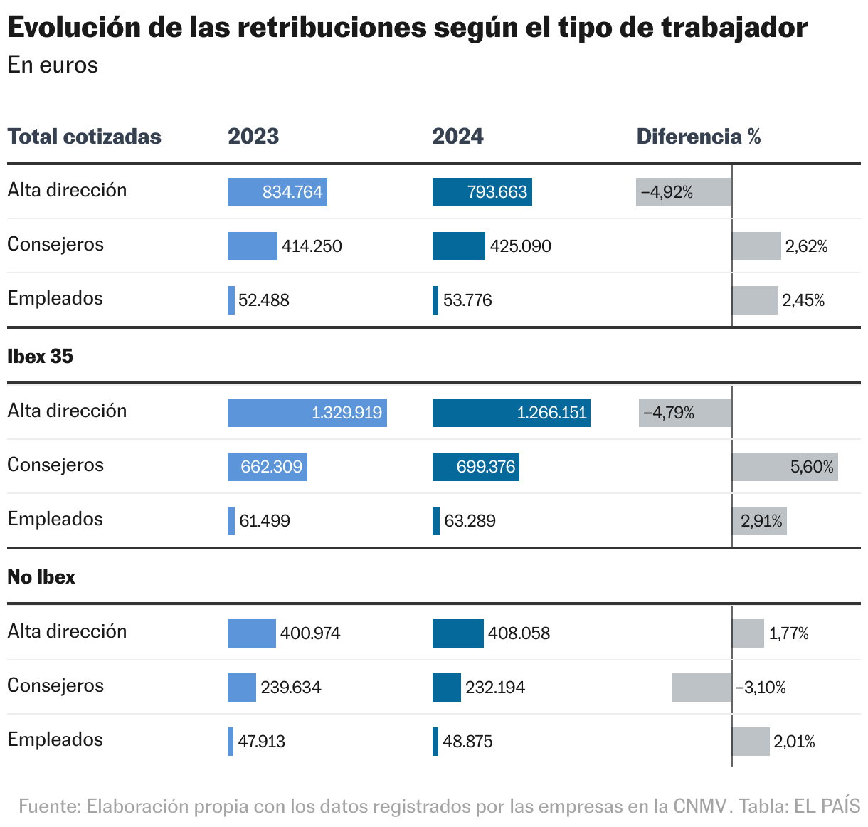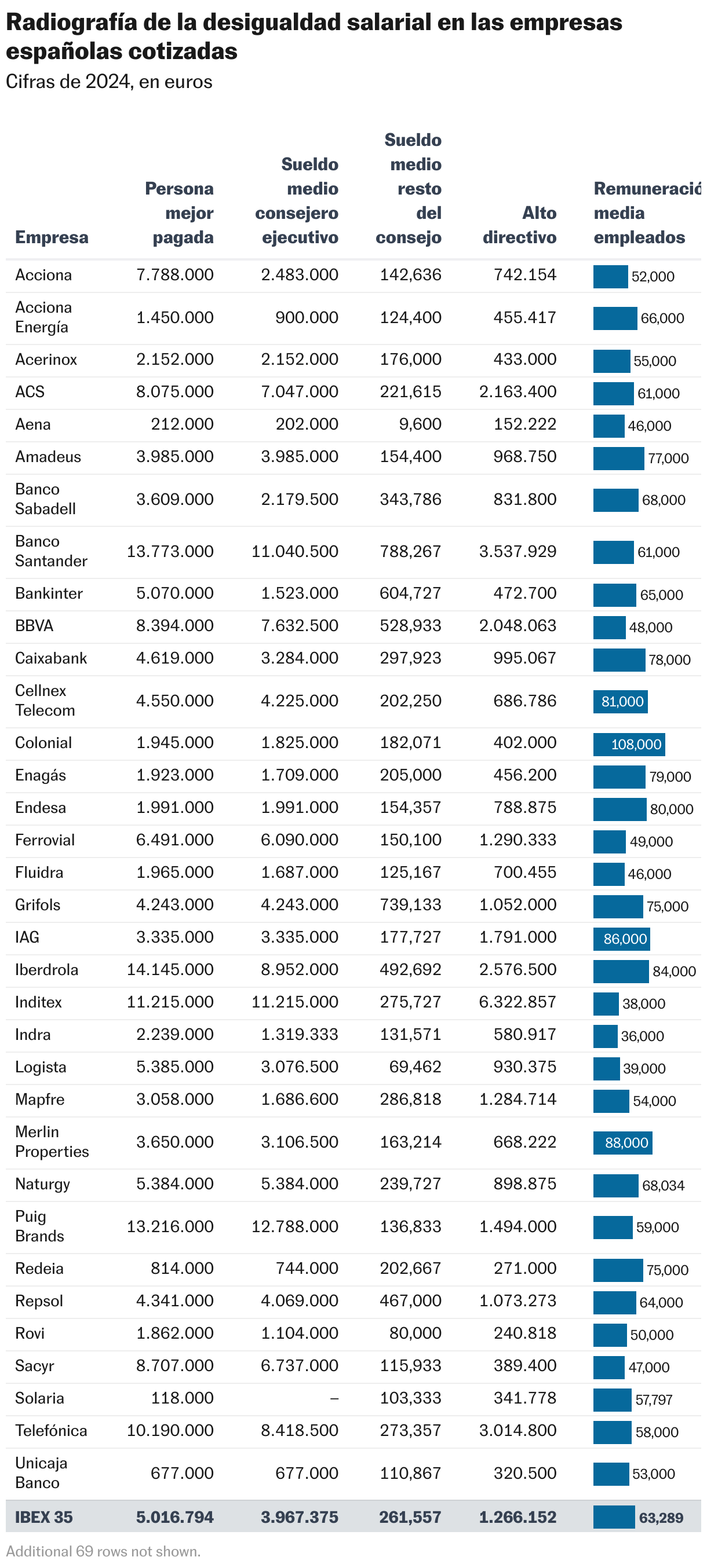 El caso de Prosegur es extremo, pero ilustra una tendencia que se cronificó en la bolsa de valores: la gran diferencia entre los salarios de los gerentes y empleados. Esta es una de las conclusiones de La decimotercera edición del informe de larga distancia, que el país está preparando con los datos enviados por los datos citados al gerente del mercado. En 2024, el consultor ejecutivo mejor pagado de IBEX 35, sin comunicación sin Arcormittal, ganó un promedio de 5.01 millones de euros. Este número corresponde a los 79 veces más que los 63,289 euros que los empleados de las empresas que lideran en promedio. Teniendo en cuenta el tiempo de contribución promedio de un empleado en España, esto es aproximadamente 36 años, pero esta diferencia significa que los empleados de IBEX, aunque tuvieron una segunda vida que no ganaría lo que sus jefes recibieron durante un solo año de trabajo. Es una brecha que se ha mantenido estable en los últimos cinco años: en 2023 el diferencial fue de 77 en 2022 fue 81 veces y en 2021 y 2020 alcanzó 76 y 79 veces.