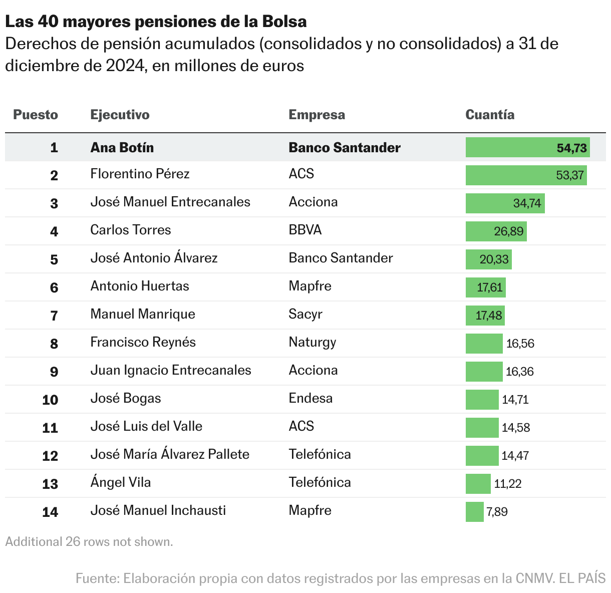 A finales del año pasado, los directores de las compañías españolas obtuvieron derechos de pensión por valor de casi 400 millones de euros. Hasta 56 administradores habían contribuido a los datos enviados por las empresas a la Comisión Nacional del Mercado de Valores (CNMV). Ana Botín corresponde a la suma acumulada más grande para la jubilación. Banco Santander se unió a 1,33 millones de euros en su presidente en 2024 y su cuenta ya ha agregado 54,73 millones. En segundo lugar, aparece el presidente de ACS. El sistema de ahorro a largo plazo ya agrega 53.37 millones después de que el servicio y la empresa de construcción contribuyó con 1.36 millones el año pasado. José Manuel Entrecanales corresponde al tercer lugar en las pensiones millonarias. En 2004, las medidas se inyectaron a su sistema de ahorro a largo plazo 3.87 millones en 2004 y ya están recaudando derechos por valor de 34.74 millones de euros.