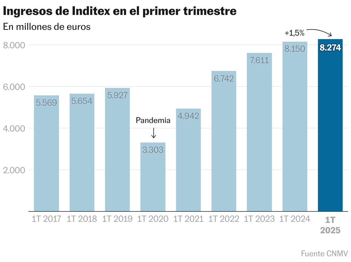 Inditex finalizó el primer trimestre de su ejercicio fiscal, transcurrido entre febrero y abril, confirmando el débil ritmo de crecimiento que ya dejó entrever a la mitad del periodo. El gigante textil gallego generó unos ingresos de 8.274 millones de euros a la conclusión del mismo, lo que implica un alza de apenas el 1,5%, con un beneficio de 1.305 millones, una mejora de solo el 0,8% con respecto al mismo periodo del año anterior. De inmediato, y nada más abrir la Bolsa, las acciones de la compañía se desploman más de un 6%.