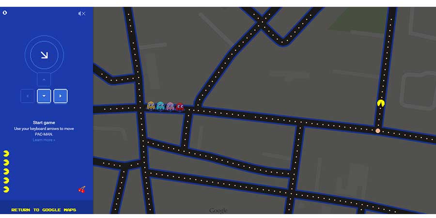 Pac-man en Google Maps. Los de Mountain View añadieron un nuevo modo a la versión móvil y de escritorio de Google Maps. Pulsando el botón de Pac-Man que aparecen al lado del GPS, el mapa se convertirá en un escenario lleno de bolas que el icónico personaje deberá comer hasta llegar a nuesto lugar de destino.
