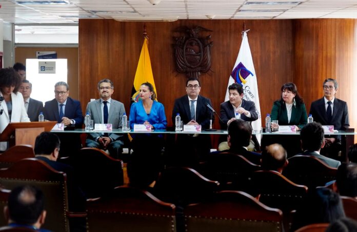 En la sede de la Corte, en el norte de Quito, ocho de nueve jueces constitucionales participaron del acto de rendición de cuentas de la gestión del 2025, que lo presidió el presidente Jhoel Escudero.