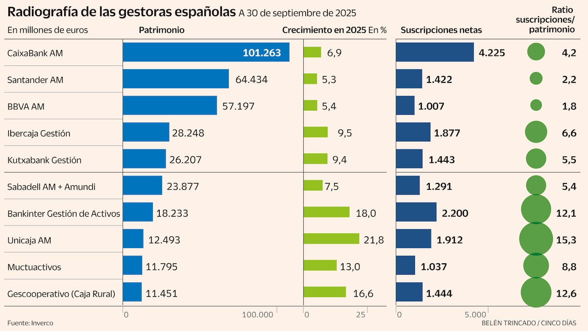 Los fondos de inversión registrados en España ya acumulan más de 445.000 millones de euros, de acuerdo con los últimos datos publicados por Inverco, la asociación sectorial. El 49% de todo ese patrimonio está concentrado en las gestoras de los tres grandes bancos españoles: CaixaBank (101.000 millones), Santander (64.000 millones) y BBVA (57.000 millones). Pero las entidades medianas están recortándoles terreno.