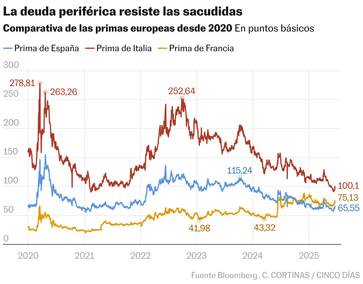 El buen comportamiento de la deuda soberana periférica contrasta con la evolución del bono francés. Francia, la segunda mayor economía del euro y antaño considerada un valor refugio, sigue lastrada por sus desequilibrios fiscales y la falta de credibilidad del Gobierno para encauzar las cuentas públicas. Aunque el diferencial con el bono alemán ha bajado desde los casi 90 puntos básicos que rozó tras la caída del Ejecutivo de Michel Barnier el pasado diciembre, su prima de riesgo se mantiene en 75 puntos, lejos de los 48 que marcaba antes de que Emmanuel Macron decidiera disolver la Asamblea Nacional tras su derrota en las elecciones europeas del 9 de junio.