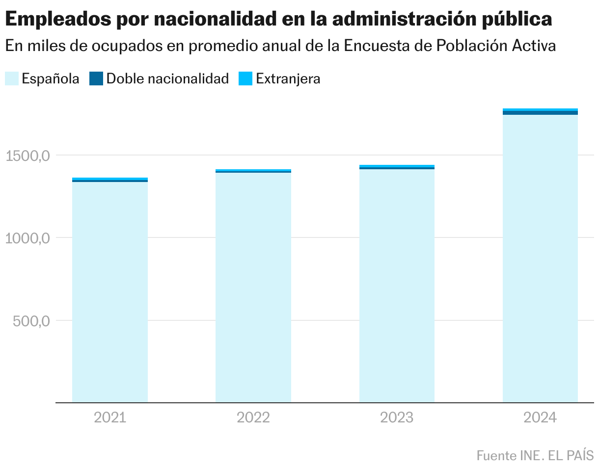 «Es importante señalar», insiste el Ministerio de Función Pública, «que España tiene convenios de doble nacionalidad con bastantes países. Por tanto, estos ciudadanos que, por ejemplo, tienen la nacionalidad colombiana y española no aparecería en el porcentaje de extranjeros en la Función Pública”. Es cierto, pero el dato apenas cambia al tomar en cuenta esa variable: según datos desagregados por el INE para este periódico a partir de la Encuesta de Población Activa, en 2024 los empleados en administración pública de doble nacionalidad eran el 1,3% del total, a los que se agrega un 0,9% de extranjeros y un 97,8% de españoles. Ha crecido con fuerza la proporción de doble nacionalidad, ya que en los años precedentes rondaba el 0,8%, pero sigue representando una porción minúscula.