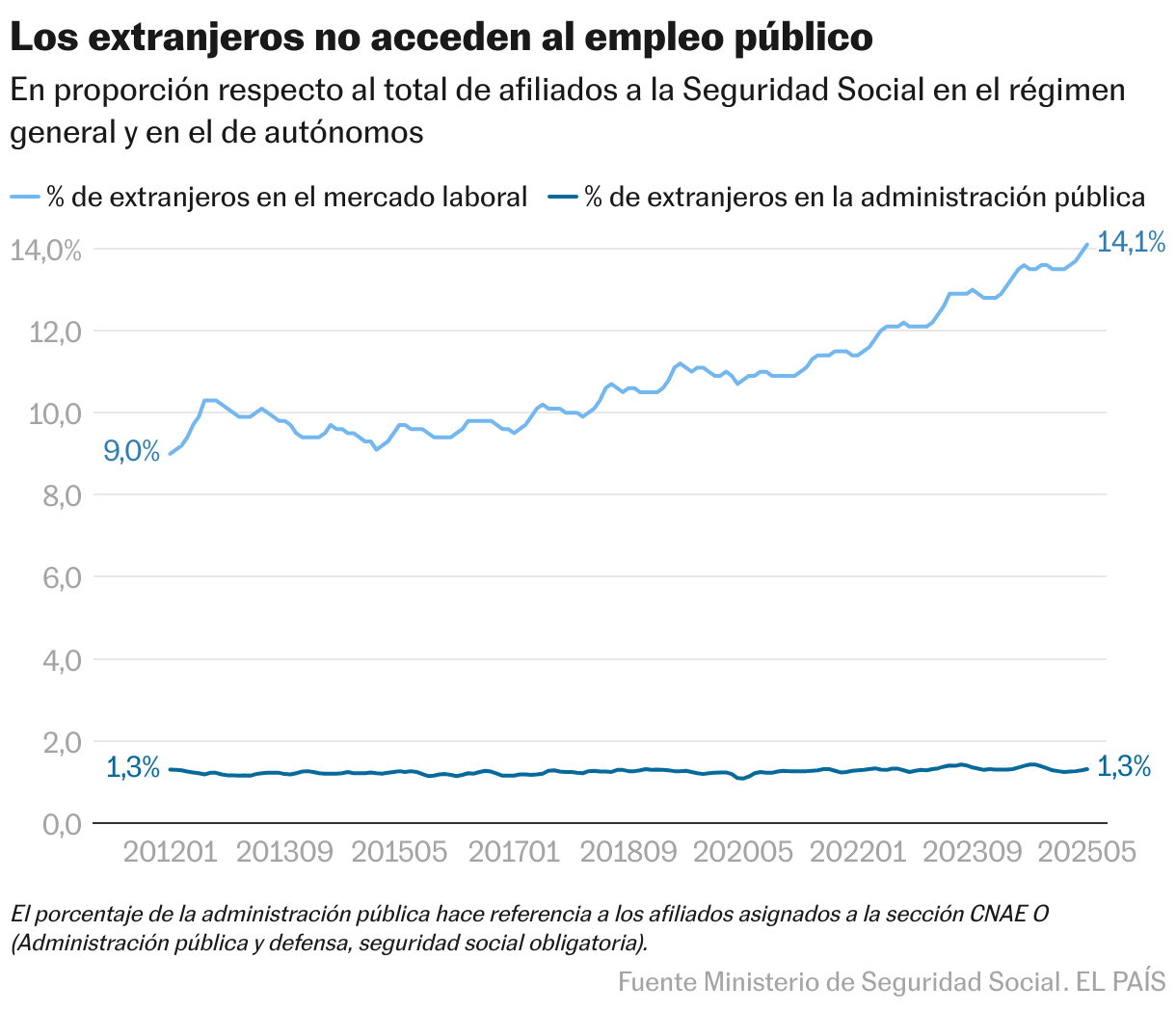 Las condiciones laborales de la administración pública son mejores que las de la mayoría de actividades privadas: estos empleados cobran un promedio de 2.949 euros brutos al mes, muy por encima de la media (2.273), y la jornada pactada semanal es de 35,8 horas, dos horas y media menos que el promedio e incluso por debajo de la reforma que plantea el Gobierno. A ello se suma la seguridad de que, con plaza de funcionario y si no hay negligencias, no te pueden despedir. Y, a la vez, es el sector con menor presencia de extranjeros de toda la economía española: son solo el 1,3% de los afiliados a la Seguridad Social en esta rama de actividad (el funcionariado más canónico y las fuerzas de seguridad, sin incluir a sanidad o educación), pese a representar el 14% de la fuerza laboral española. Son tan pocos entre los funcionarios como hace diez años, cuando había la mitad de extranjeros empleados en España. Cada vez son más en el sector privado, especialmente en los terrenos más precarios, y, al mismo tiempo, son anecdóticos en la administración.