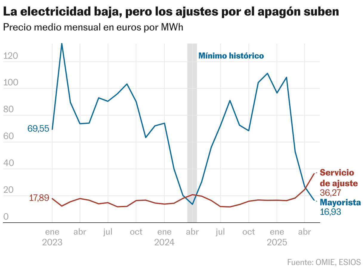 Aunque la mayor parte de esta fuerte subida en los servicios de ajuste es directamente achacable a la actuación con pies de plomo de REE para evitar una recidiva, el aumento viene de atrás. En abril, antes del apagón, esta partida ya se había situado en niveles históricamente elevados, recuerda Valverde. “Lo de mayo ya ha sido récord al cuadrado”.