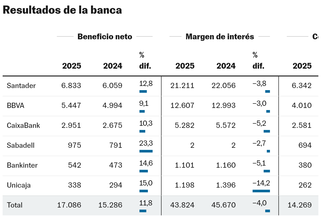 Por último, Unicaja y Bankinter han logrado los mayores aumentos de beneficios de la banca cotizada, con subidas del 15% y el 14,6%, respectivamente. Unicaja ha ganado 338 millones y Bankinter unos 542 millones. Este último ha sido el que más ha aumentado sus ingresos por comisiones del grupo de los seis grandes, con un 11,1% más, hasta los 380 millones. El que más ha reducido el margen de intereses ha sido Unicaja, un 14,2%, hasta los 11.198 millones.