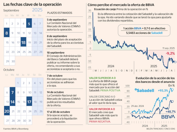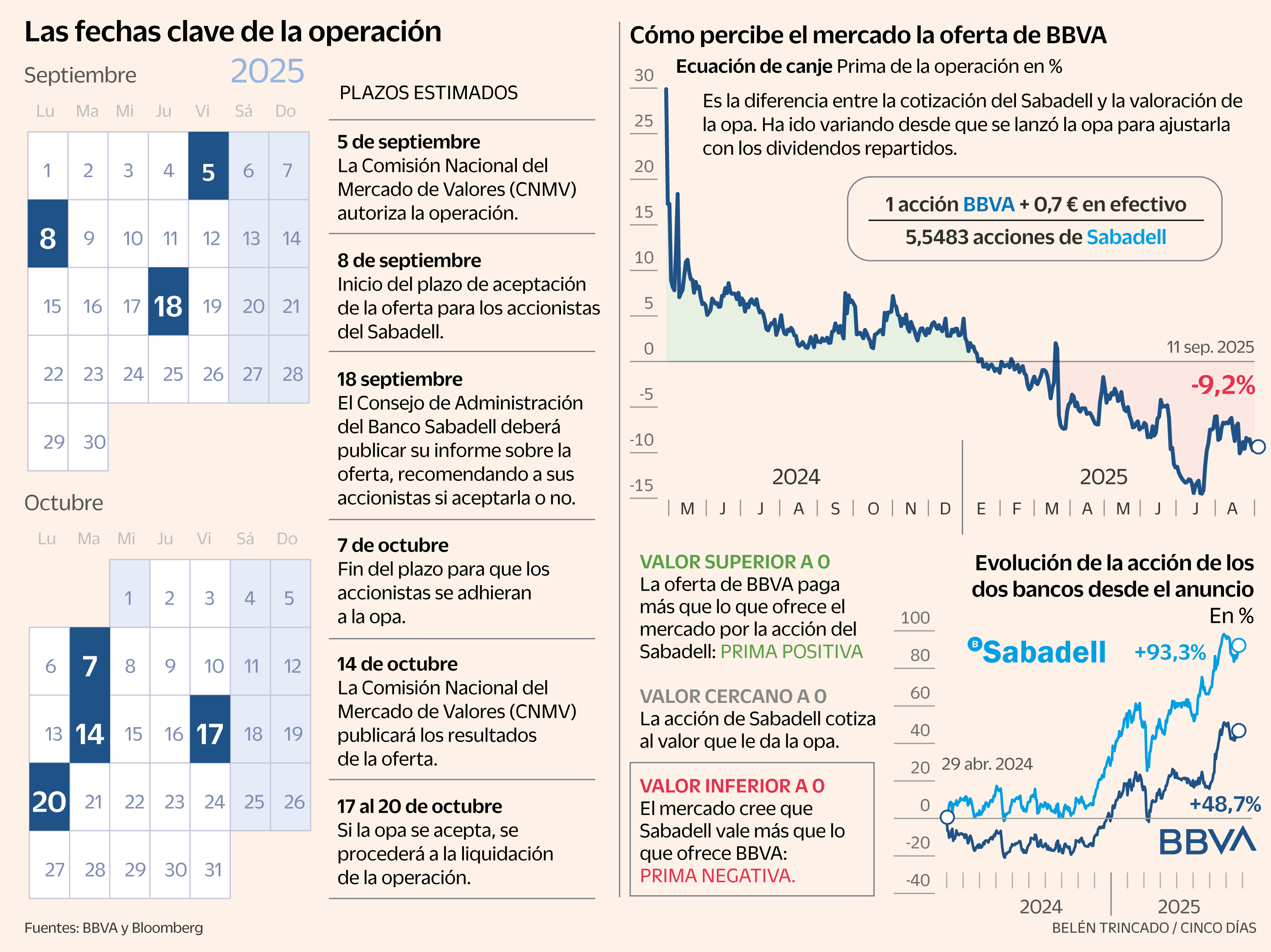 Este viernes termina la primera semana de la oferta del BBVA por el Banco Sabadell. Una opa que se planteó a principios de mayo de 2024 pero que no ha entrado en la fase definitiva hasta este septiembre. La hora de la verdad para la operación corporativa más polémica en España en casi las últimas dos décadas; está en manos de los accionistas de la entidad catalana decidir si esta continúa su camino de manera independiente o si, con las estrictas salvaguardas fijadas por el Gobierno, cae dentro del perímetro de BBVA.