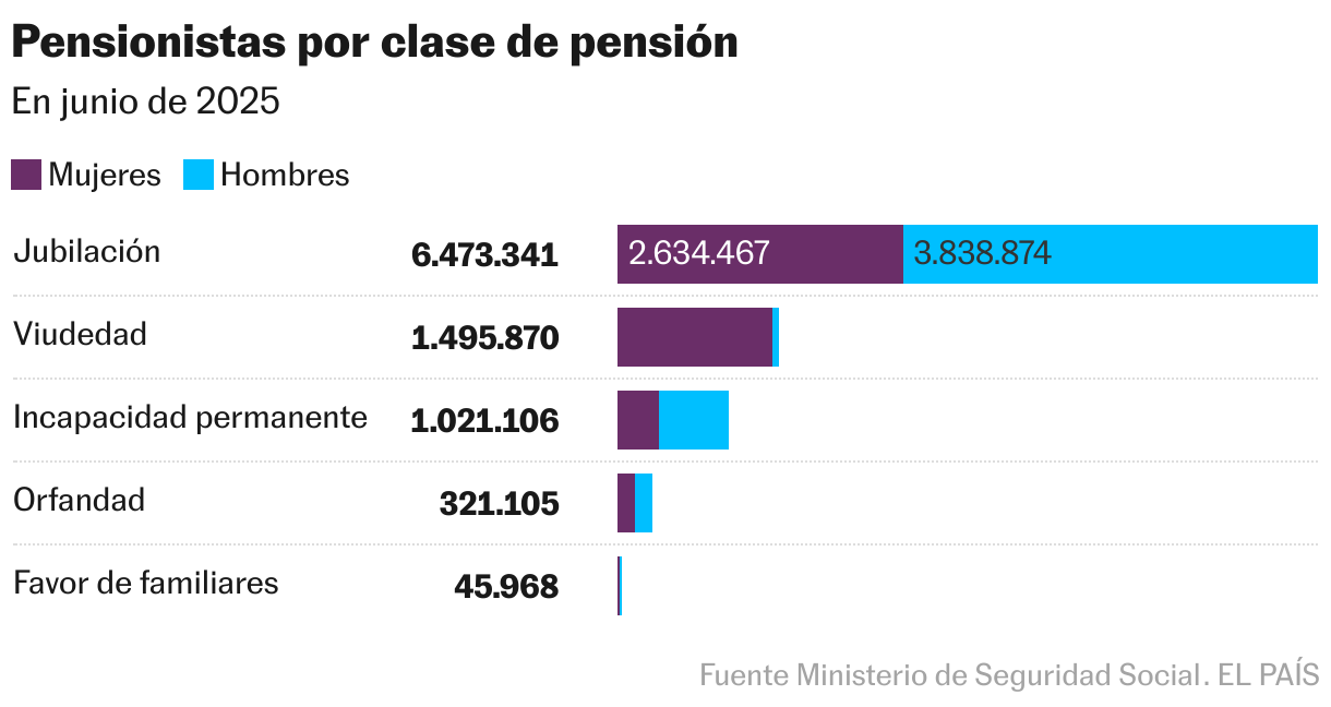 Por número de pensionistas, hay 4,36 millones de mujeres y 4,72 millones de hombres. Sin embargo, hay más pensiones de mujeres (5,45 millones) que de hombres (4,89 millones). Esto sucede porque es más frecuente que las mujeres reciban más de una prestación, con la de viudedad como una de las más habituales en esas combinaciones. Ellos son más entre los pensionistas por jubilación e incapacidad permanente, mientras que ellas son más en viudedad, orfandad y favor de familiares.