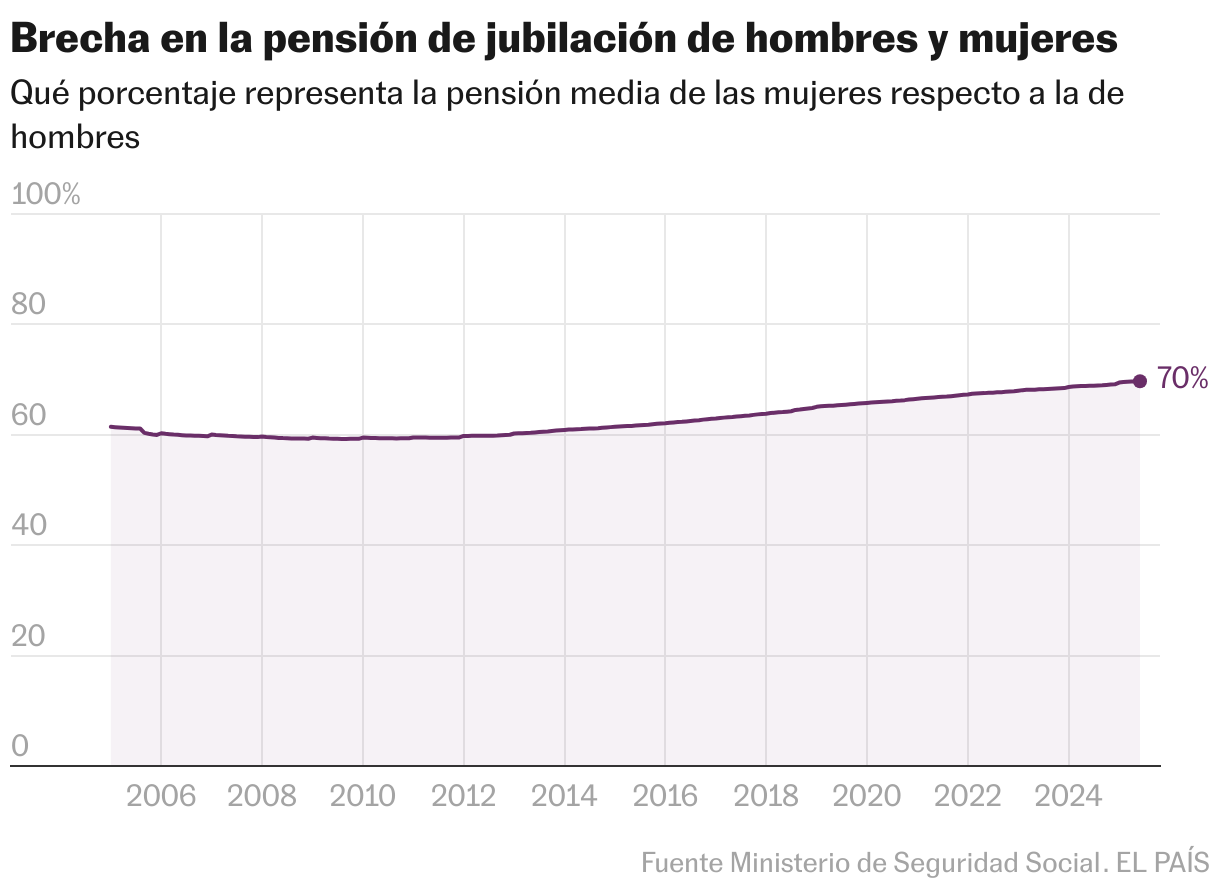 La ugetista apunta a otros motivos que explican esta tendencia: “La reforma de pensiones que pactamos en 2023 hace que los tiempos parciales cuenten como tiempo completo a efectos de cotización. Esto favorece las pensiones de las mujeres, que asumen la mayor parte del tiempo parcial”. Estévez cree que las nuevas coberturas de las lagunas de cotización y la subida del salario mínimo [que ha crecido un 61% desde 2018 y tiene más prevalencia entre las mujeres] también juegan un rol clave en este fenómeno.