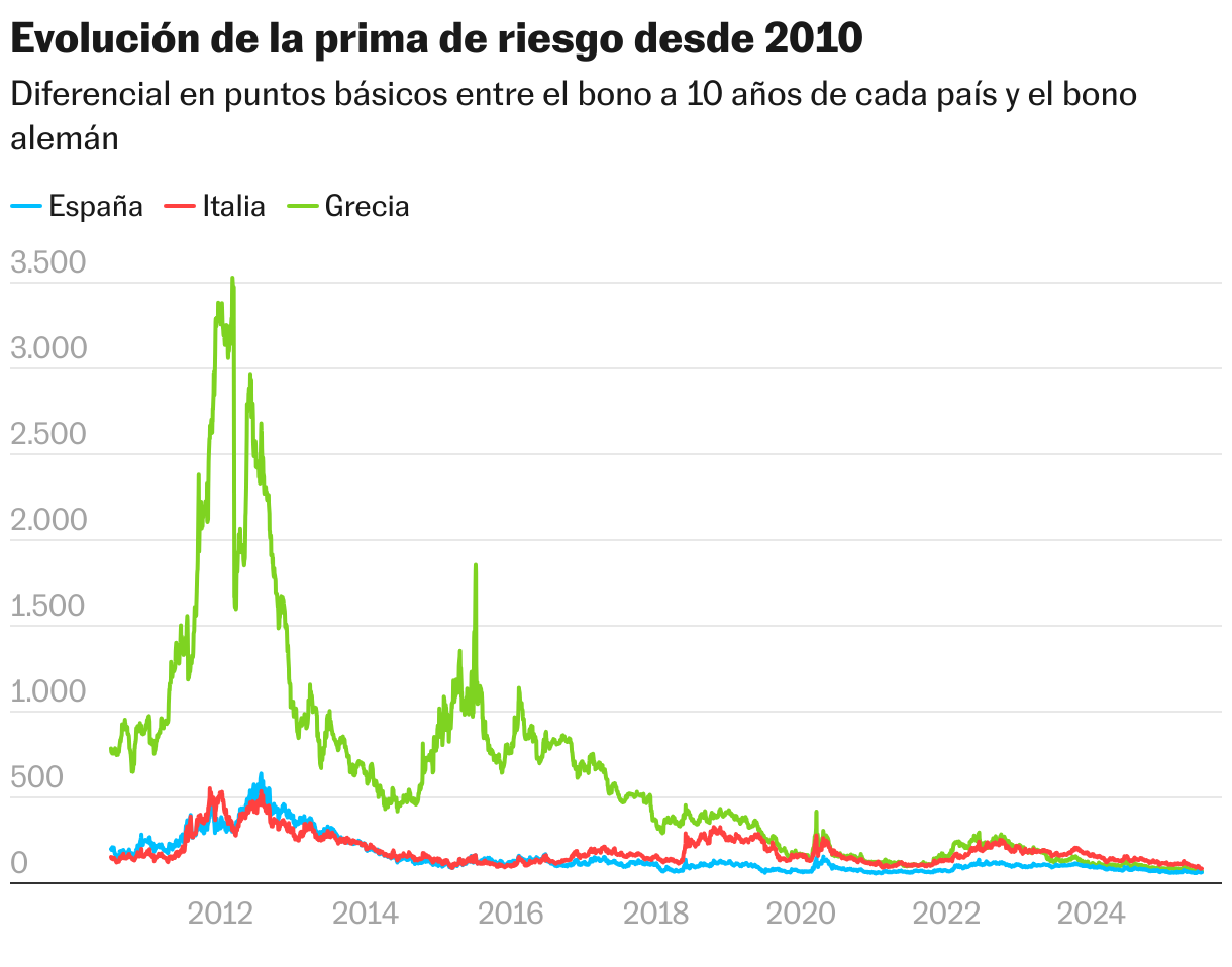La contracción se replica en Italia, donde el diferencial cae de los 90 puntos básicos (llegó a los 327 a finales de 2018) y con la prima de riesgo de Grecia, que rozó la quiebra hace 15 años, en torno a los 70. Estos niveles son inferiores incluso a los registrados en la pandemia, cuando el BCE ayudó a mantener estables las rentabilidades de la deuda con los tipos cero y las compras masivas de activos. Hoy la institución que preside Christine Lagarde ha ejecutado ocho rebajas de tipos en los últimos 13 meses, las tasas rondan el 2%, y la reducción de sus tenencias de bonos, al dejar de reinvertir los vencimientos, está pasando desapercibida.