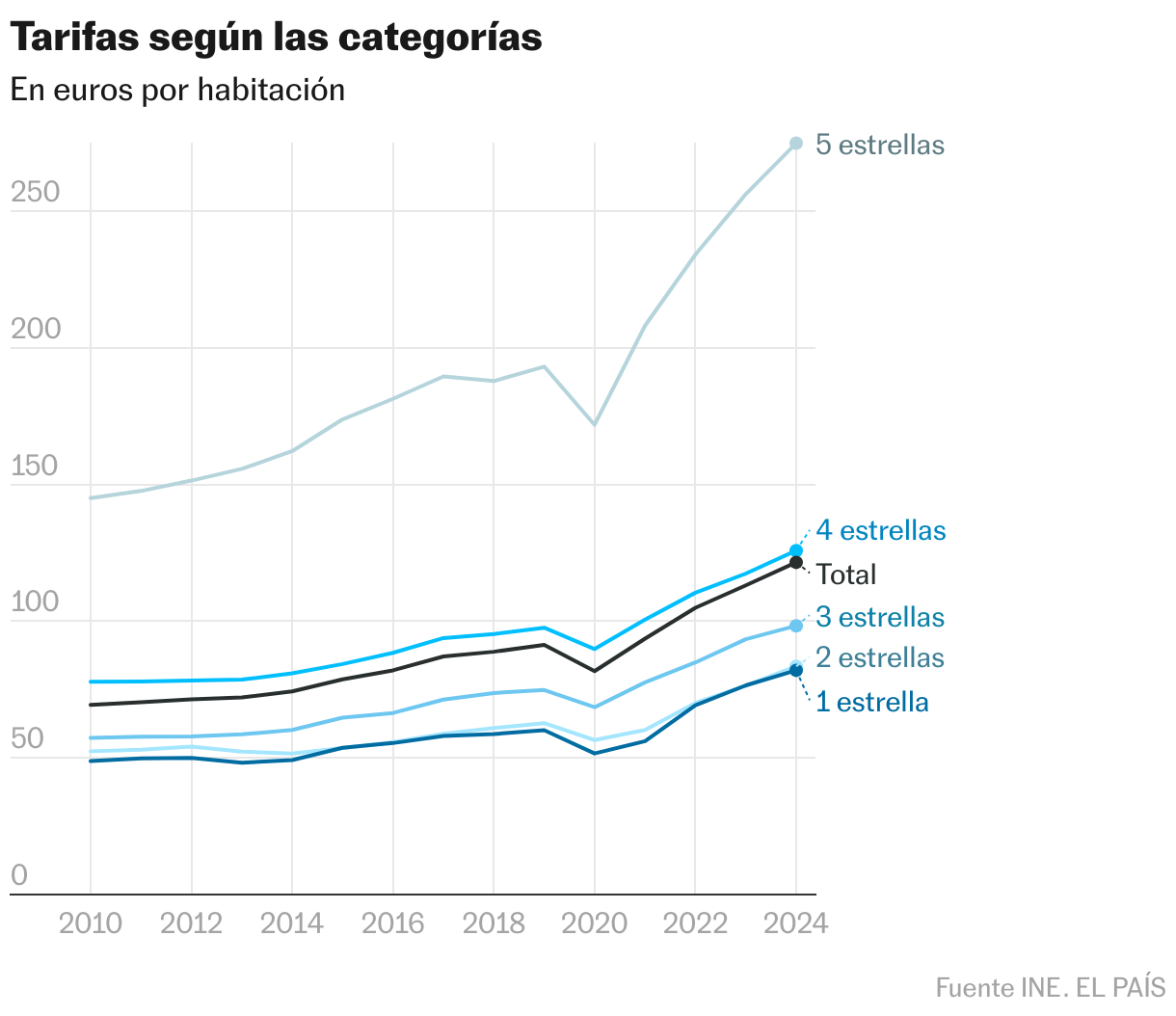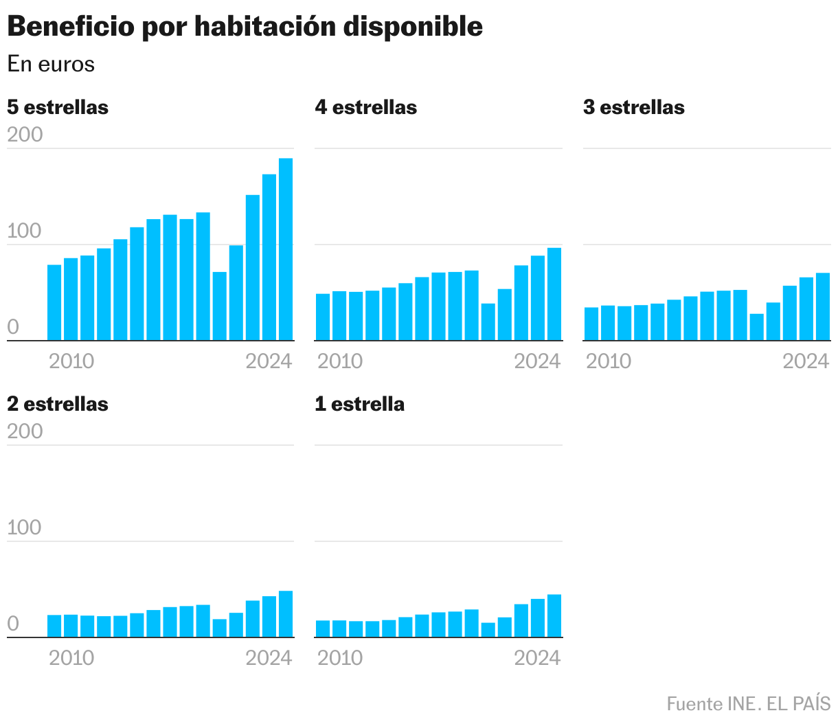 En 2007 dormir en una habitación de un hotel de cinco estrellas en España costaba de media 145 euros. Diecisiete años después, la tarifa se ha casi duplicado hasta los 275 euros. El beneficio por habitación disponible (Revpar por sus siglas en inglés), el principal indicador de rentabilidad que miran los inversores, se ha casi triplicado hasta los 190 euros. Jorge Ruiz, director de Hoteles en Iberia de CBRE, cree que la clave se encuentra en la apuesta por la calidad y la diferenciación: “España ha demostrado sus buenos fundamentales de mercado, con un crecimiento sostenido y sostenible apostando por un turismo de calidad que está evolucionando hacia una oferta mucho más experiencial y a la medida del turista”.