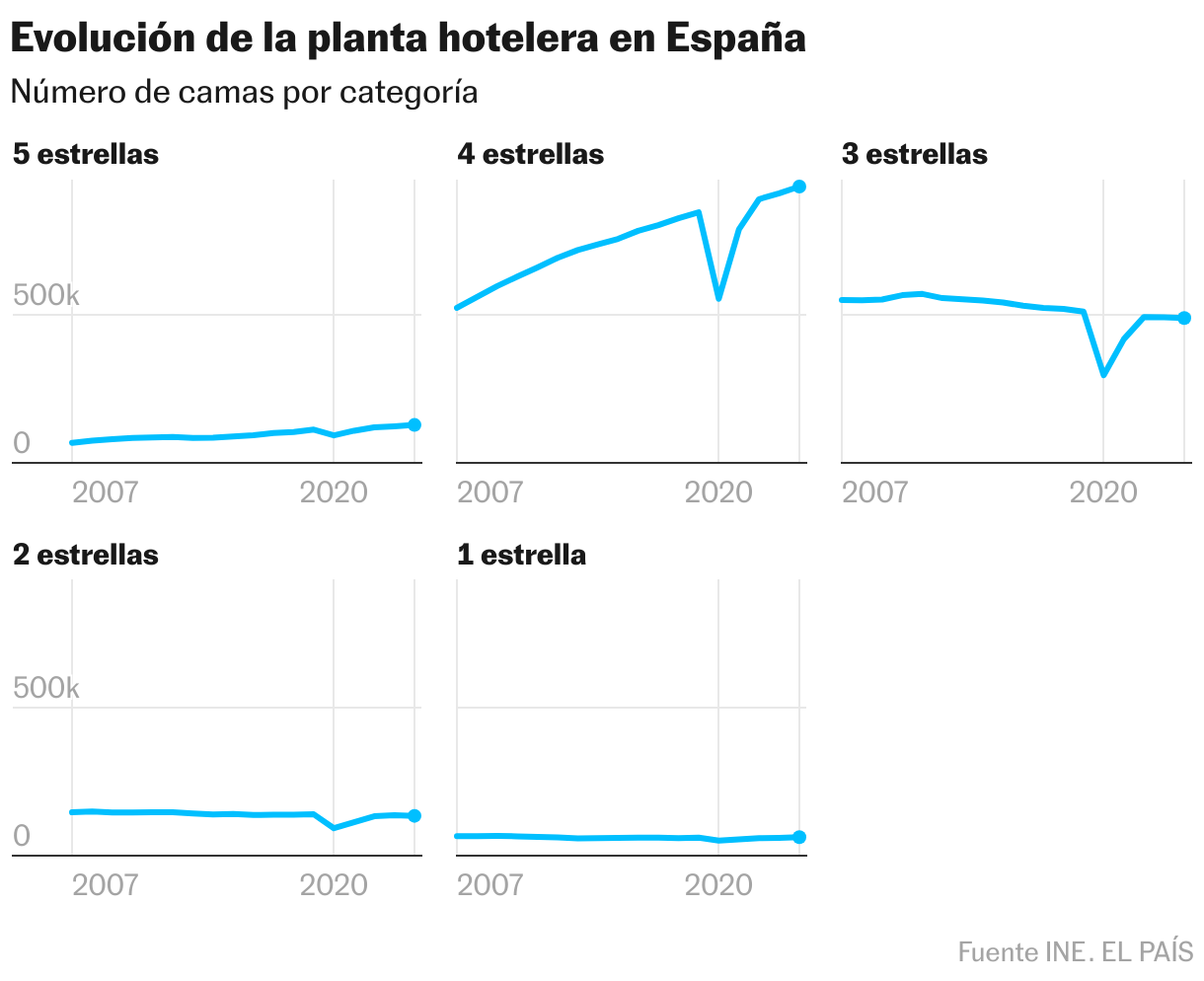 El perfil de la industria hotelera en España ha mutado desde que la Gran Recesión estalló tras quince años consecutivos de crecimiento económico. En 2007 había 1,56 millones de camas disponibles, según el censo oficial que realiza el INE, y la categoría que más aportaba era la de tres estrellas, con 549.878 camas, lo que suponía un 35% del total, seguida muy de cerca por los de cuatro estrellas, con 523.041 camas y un 33,4% del total.