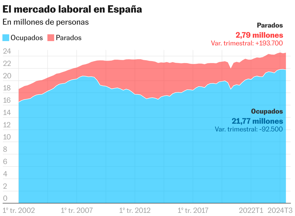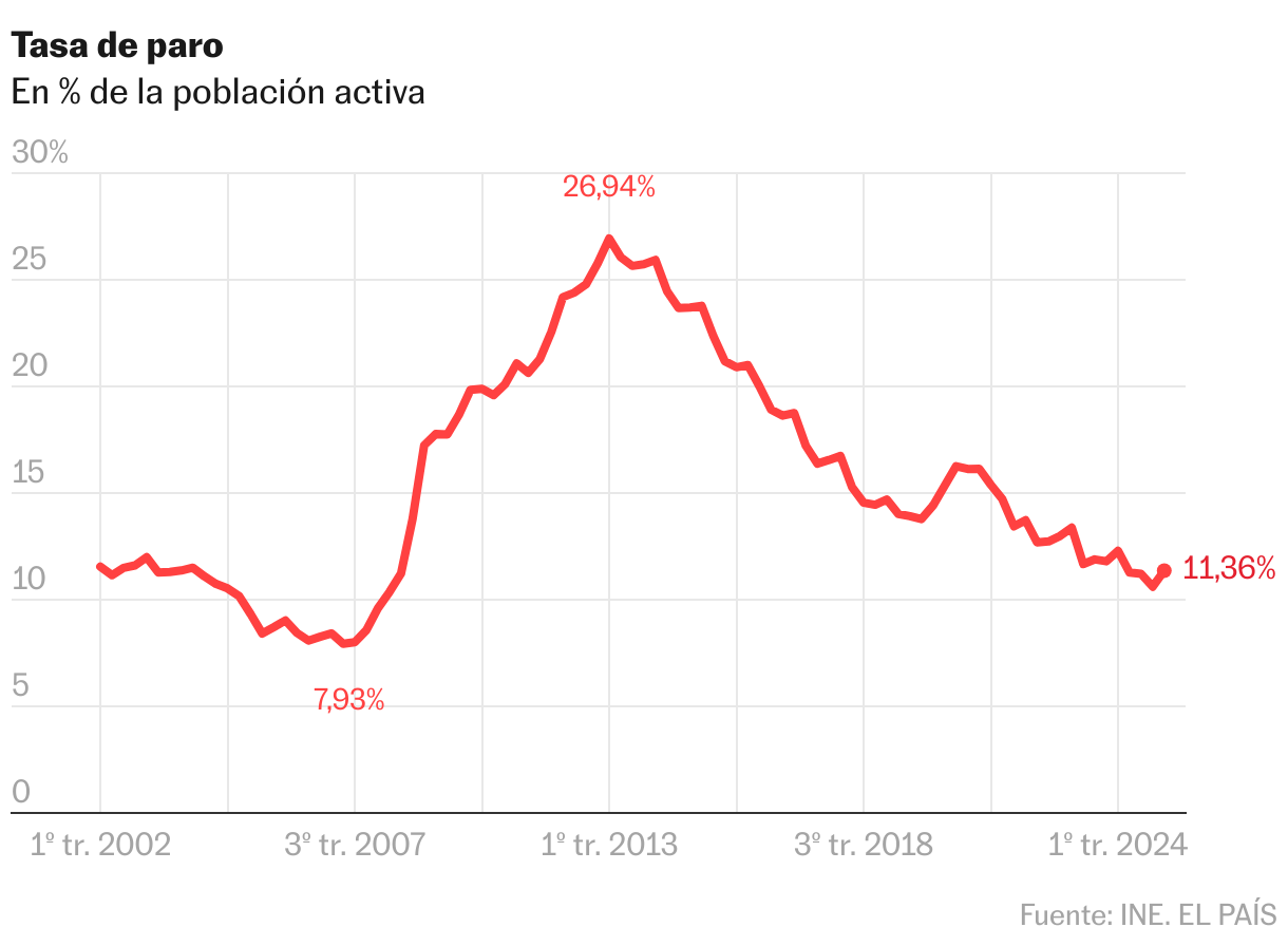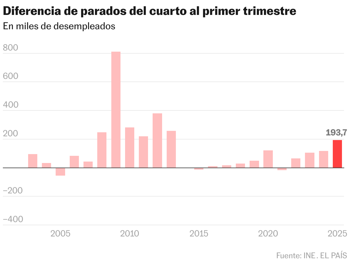 Según la encuesta de población activa (EPA), el primer trimestre de 2025 arroja malas cifras para el mercado laboral. El desempleo está creciendo fuertemente: proviene de 2.56 millones de desempleados a fines de 2024 a 2.79 de este primer trimestre. Es un aumento de 193,700 desempleados, el mayor salto en esta temporada desde 2013. En plena recesión. Esta aceleración provoca la tasa de desempleo (la proporción de desempleados en relación con la población activa) de 10.61% a 11.36%. Es un aumento de casi ocho décimas, también el más grande desde 2013. Al mismo tiempo, el número de empleados sufre con una contracción de 92,500. Los datos son algo mejor que el año pasado cuando la profesión cayó en 139,700 personas.