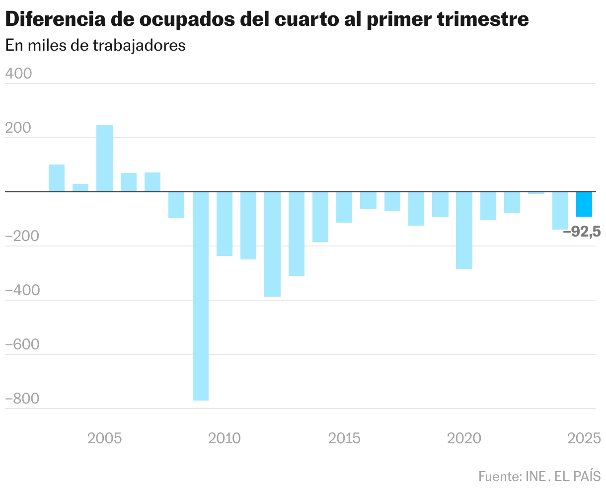 El primer trimestre es el peor para el mercado laboral español. En promedio, es en promedio en el que la profesión cae más y el desempleo crece. Esto se debe Factor estacional de la economíaLas campañas turísticas influyen fuertemente en los datos: la Semana Santa generalmente promueve el número del segundo trimestre, en el que también se da el escenario para el verano. El tercero incluye los meses de verano; Y el cuarto trimestre tiene el impulso navideño. El primer trimestre del año permanece en cualquier país, a menos que la Semana Santa caiga en los primeros tres meses que no tuvieron lugar en 2025.