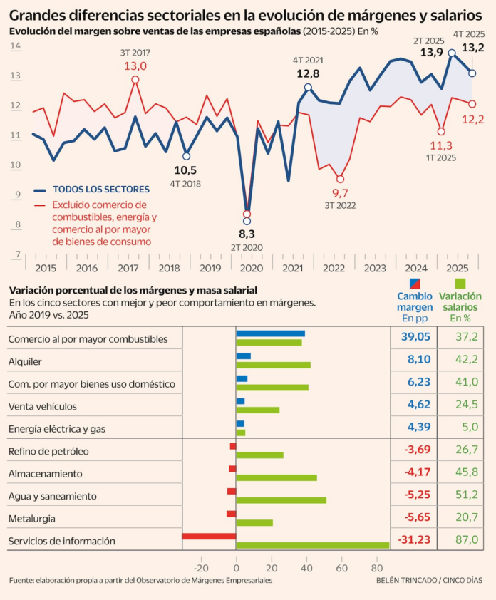 Cada trimestre, cuando se publican los datos del Observatorio de Márgenes Empresariales (OME), se repite un guion previsible. Los sindicatos señalan que los márgenes de las empresas han crecido sustancialmente desde la pandemia y reclaman una respuesta en forma de subidas salariales generalizadas. Los datos agregados les dan, aparentemente, la razón: el margen sobre ventas ha pasado del 11,5% en 2019 al 13,4% en 2025, casi dos puntos porcentuales más, y casi toda esta subida en los últimos tres años. El excedente bruto de explotación ha crecido un 56% en ese periodo, frente al 35% de la masa salarial. Por lo tanto, imposible no darles la razón.