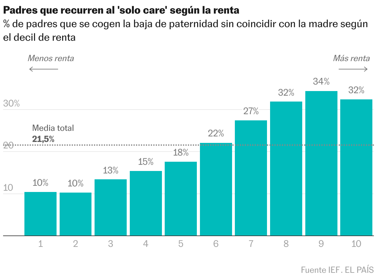 Así lo señala el documento de trabajo ¿Qué factores influyen más en que los padres usen el permiso por nacimiento sin solaparlo con la madre? Caracterización del ‘solo care’ en España y comparativa con los países de la Unión Europea, publicado esta semana por el Instituto de Estudios Fiscales y firmado por las investigadoras Adela Recio y Cristina Castellanos. El análisis sugiere que el nivel de renta es el principal factor que determina si un padre decide cuidar en solitario a su bebé una vez que la madre se reincorpora al trabajo. Es decir, sin que ambos permisos se solapen pasadas las primeras seis semanas tras el nacimiento, que son obligatorias e ininterrumpidas para ambos. Esta modalidad, conocida en el entorno académico como solo care, es la “forma más avanzada de corresponsabilidad”, explica Recio: el padre se queda al frente, desarrollando competencias y rompiendo la lógica tradicional que históricamente ha atravesado a los cuidados.