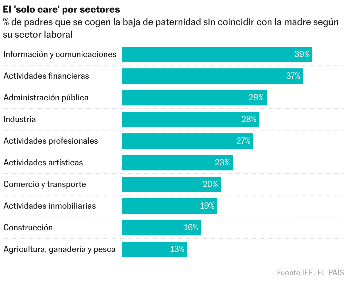 España tiene todavía camino por recorrer en esta materia. Las diferencias por renta y sector son clarificadoras. En los niveles más bajos de ingresos, únicamente el 10% de los padres recurre al solo care, un porcentaje que va ascendiendo según crecen los salarios y que se triplica, hasta superar el 30%, en los deciles superiores. Por actividades la tónica se repite. Los sectores manuales, aparentemente menos cualificados, tienen una incidencia testimonial de la corresponsabilidad plena. En la agricultura, ganadería y pesca es solo de un 13,3% y en la construcción, un 16%. Al otro lado, en las telecomunicaciones y las actividades financieras el porcentaje roza el 40%.