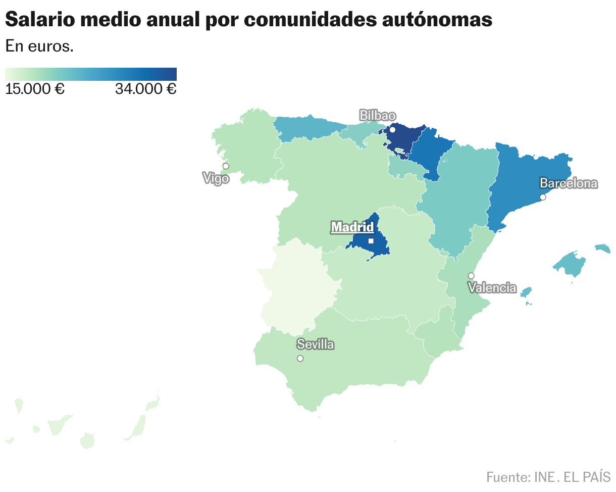 La distribución territorial de los salarios de 2023 sigue evidenciando la fortaleza de comunidades autónomas como el País Vasco (33.504), Madrid (32.219) o Navarra (31.199), que ofrecen las remuneraciones más elevadas. En contraposición, las tres medias más bajas se dan en Canarias (24.033), Castilla-La Mancha (24.885) y Extremadura (23.684). Sin embargo, de acuerdo con las tablas del INE, son mayoría las regiones que ofrecen salarios por debajo de la media, once en total.