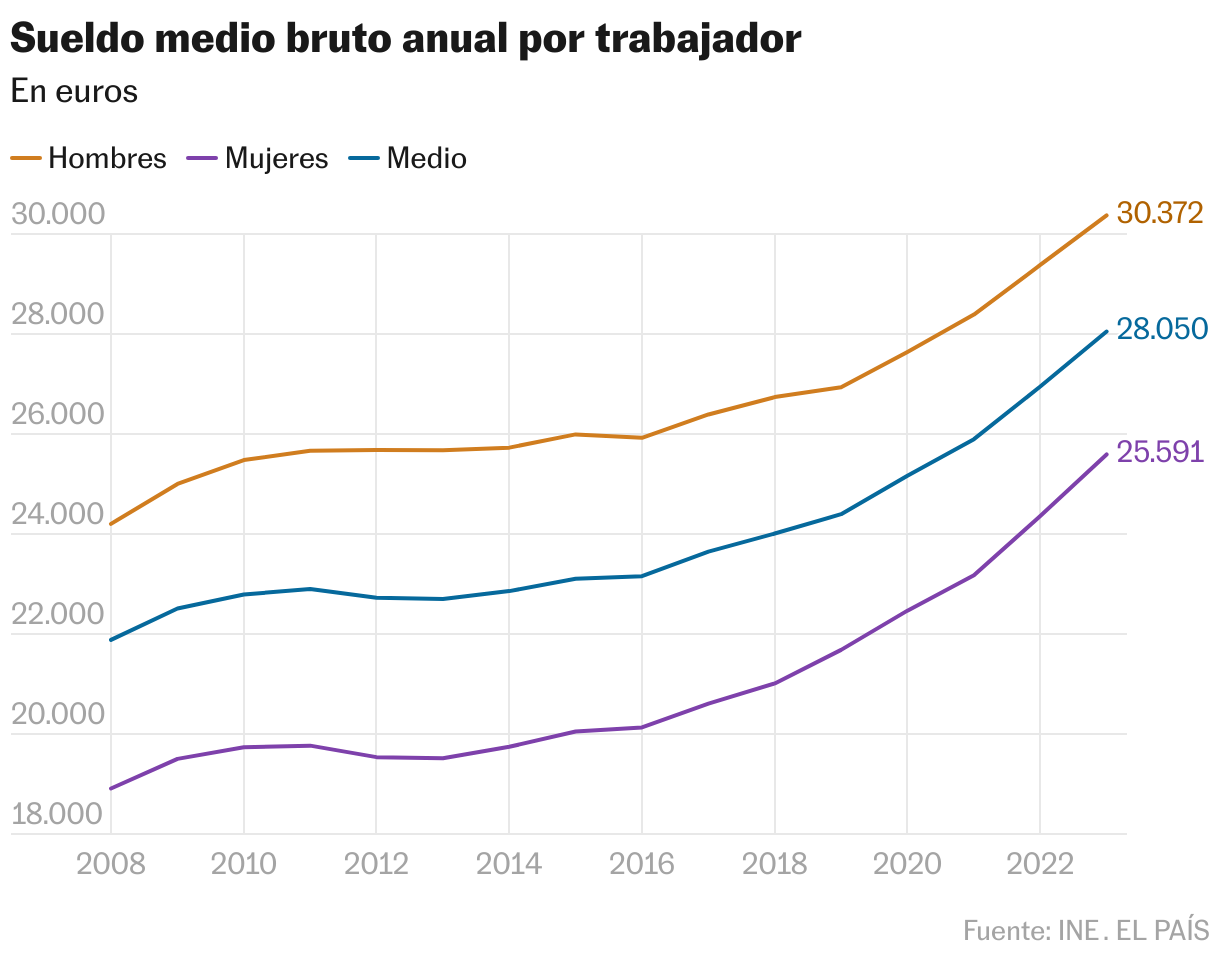 De acuerdo con los datos del instituto estadístico, los hombres percibieron una retribución bruta media anual de 30.372,49 euros, frente a los 25.591,31 euros de salario medio para las mujeres. La brecha de género se acortó algo en 2023 porque los sueldos de ellas subieron más que los de ellos (un 5,1%, frente a un 3,4%). Pero aun así la diferencia entre hombres y mujeres fue de 4.784 euros brutos al año.