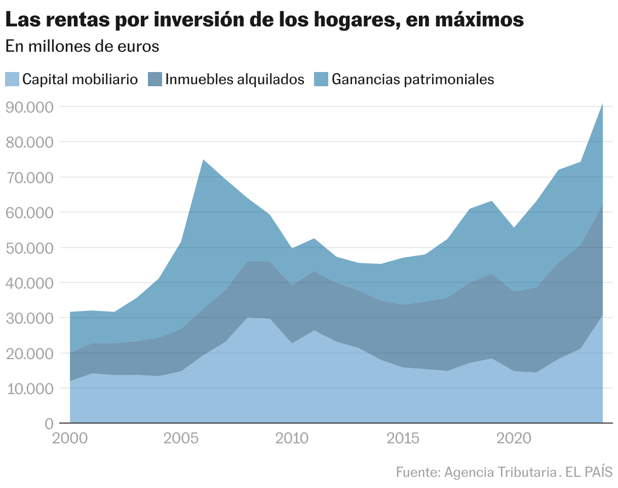 Leer Inversión Nunca habían informado tantos rendimientos para casas españolas como el año pasado. El ingreso bruto se conservó por primera vez en la historia. A través de estos caminos En un solo año cruzan conjuntamente 90,000 millones de euros, un número que corresponde al progreso del 22.6% en comparación con 2023 y que se dobla después de la crisis financiera de 2008 curvas. También excede las dimensiones logradas durante el período antes del estallido de la burbuja inmobiliaria, que hasta ahora no han sido fechadas. Esto muestra los últimos datos de la autoridad fiscal que reflejan cuántas familias recaudan Cultiva tu legado Debido a este tipo de instrumentos que generalmente se asocian con contribuyentes de altos ingresos. La agencia enfatiza tres grandes fuentes de ingresos para las familias: capital de muebles, ganancias patrimoniales y rendimientos para apartamentos alquilados.