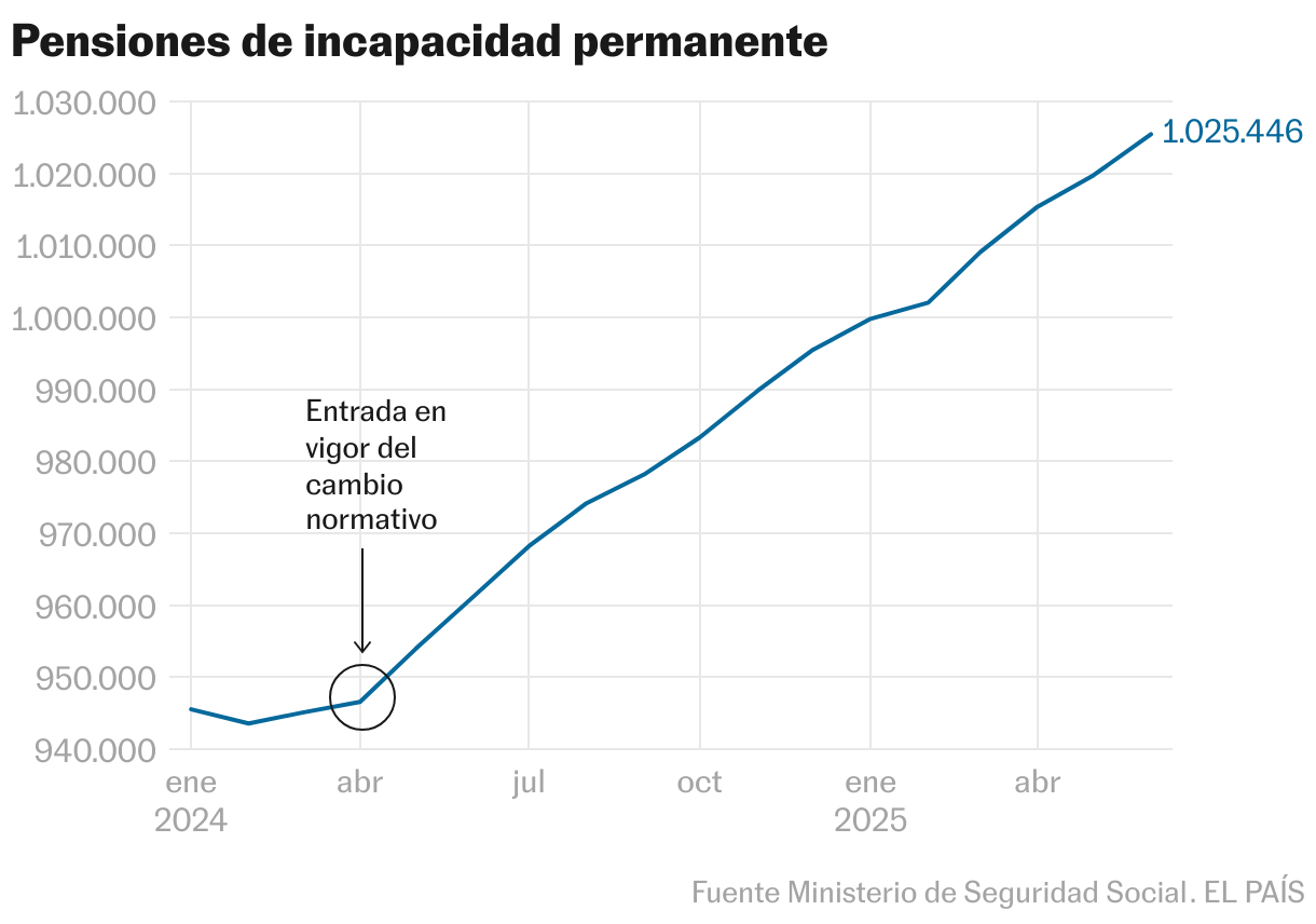 El aumento de las incapacidades temporales (IT) es un mal que afecta tanto a las cuentas públicas del Estado, como a las empresas privadas. El auge de las bajas laborales está también detrás del incremento del absentismo, un fenómeno que para este año supondrá un coste de 32.800 millones de euros, según cálculos de la patronal CEOE, que denuncia que las empresas deberán sufragar 16.000 millones, la mitad del total. Sin embargo, a la par de la subida de las IT también se está gestando otra de dimensiones similares: la de las incapacidades permanentes, cuyas consecuencias económicas son igualmente preocupantes. De acuerdo con los registros del Ministerio de Seguridad Social, entre enero de 2024 y junio de 2025 este tipo de pensión se ha disparado un 8,45%, de 945.530 a 1.025.446.
