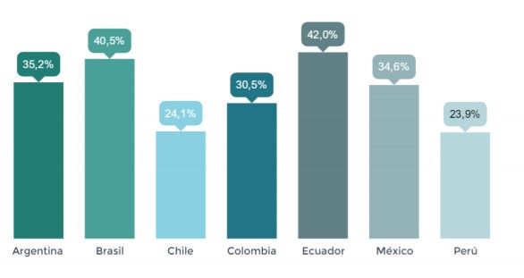 Por otro lado, el coste medio de una factura celular en Ecuador es de $21,3 al mes, situando al país en el cuarto puesto de un ranking que lideran Chile ($29,8), Brasil ($26,9) y Perú ($22,7). En el otro extremo, encontramos a Colombia ($16,8), Argentina ($15,8) y México que, con un coste medio de $13,7 mensuales, se revela como el país con los servicios de telefonía celular más económicos de todos los analizados.