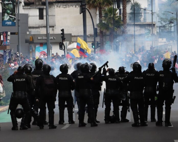 Pasadas las 13:00, cientos de manifestantes se concentraron en la avenida Patria, donde permanecieron cerca de 40 minutos. Posteriormente, fueron dispersados por la Policía con gases lacrimógenos. Algunos asistentes se replegaron al interior del parque El Ejido y otros se retiraron hacia el norte, por las calles Francisco Robles o Veintimilla.