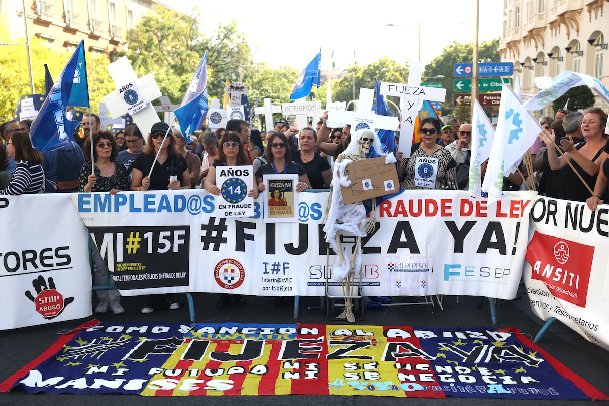 Las Administraciones públicas españolas tienen más de 700.000 trabajadores interinos, además de otros 648.000 con categoría de personal laboral (temporal, indefinido e indefinido no fijos) pendientes de lo que diga la justicia europea sobre las condiciones para hacerlos fijos o no. Este jueves se esperan las conclusiones del Abogado General de la UE al respecto, y como anticipo alrededor de 200 personas se han concentrado este martes ante el Congreso de los Diputados para denunciar el abuso de temporalidad en el sector público. Decenas de asociaciones, sindicatos y plataformas de empleados públicos temporales de toda España secundan la protesta, en la que se han gritado proclamas como “basta de fraude de la Administración” o “fijeza ya”. Los participantes han reclamado una “solución definitiva” para su situación y han exigido la recontratación de los interinos que han sido cesados por superar tres años en el puesto sin consolidar la plaza.