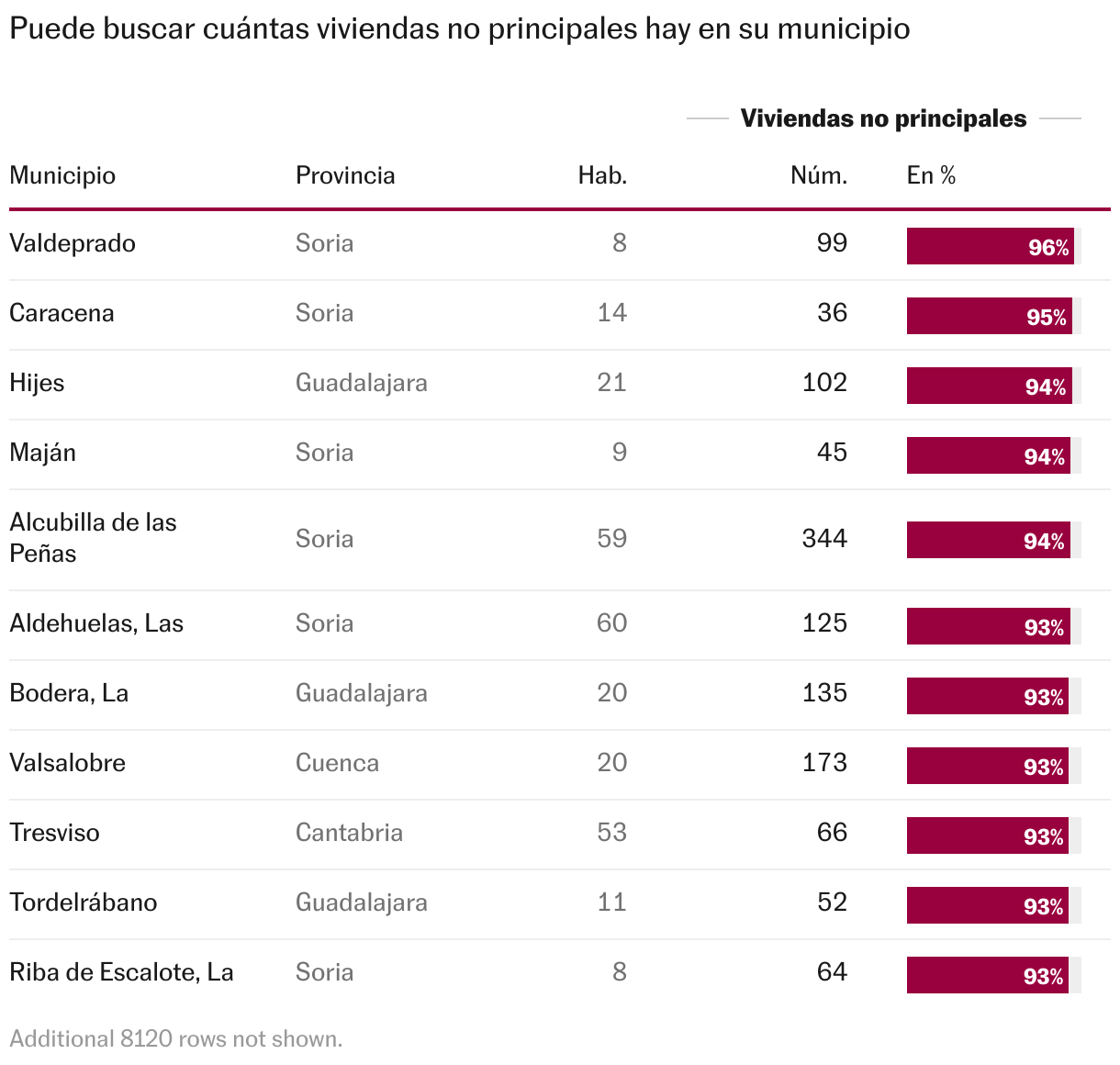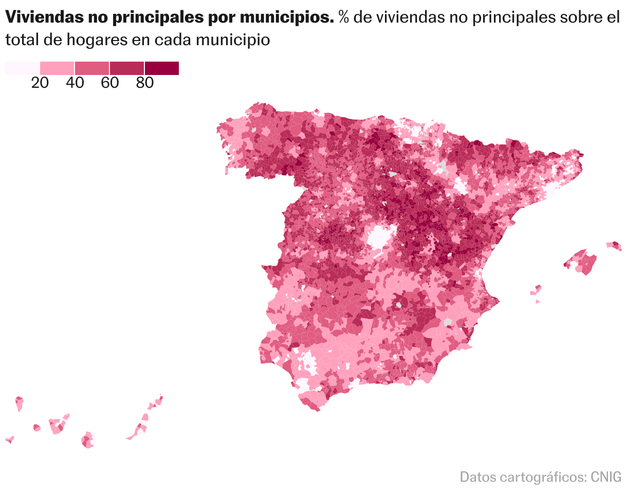 Al analizar el mapa que dibujan los datos ―independientemente del número de casas que tenga cada municipio―, las mayores proporciones de vivienda no principal se dan en la conocida como España vaciada. Allí, pequeñas localidades de Soria, Guadalajara, Cuenca o Teruel concentran porcentajes superiores al 90%. En otras algo más grandes, como Medina de Pomar y Villacaryo (Burgos) o Sigüenza (Guadalajara), la tasa supera el 65%.