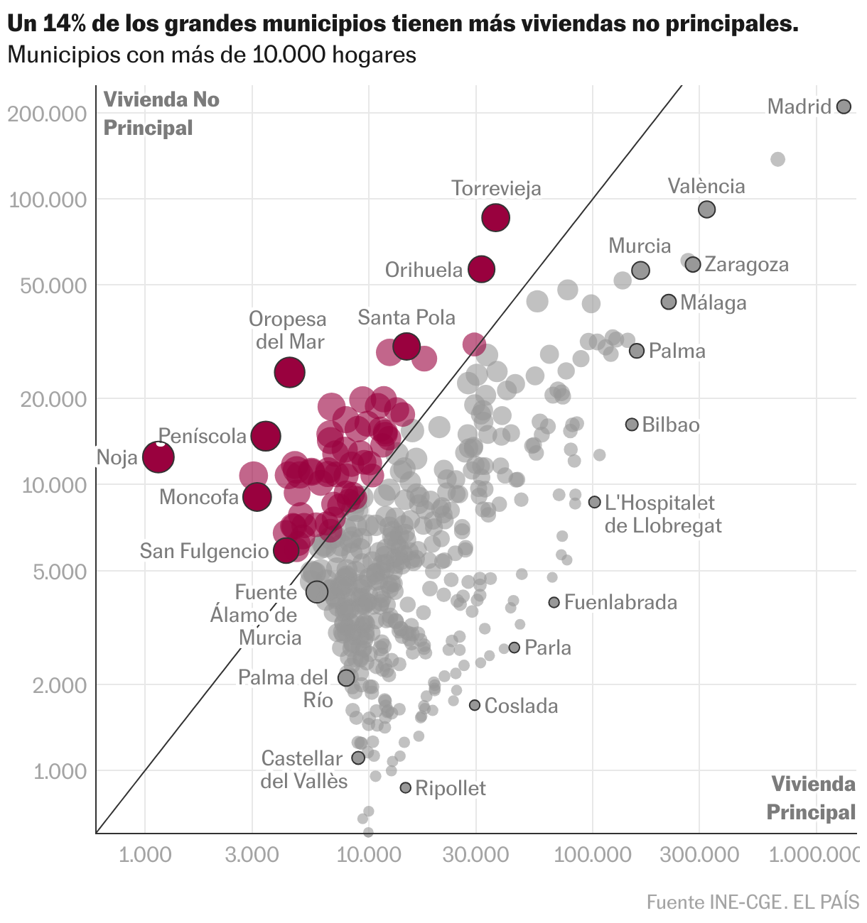 La radiografía la ofrece el Consejo General de Economistas en sus fichas socioeconómicas, actualizadas recientemente con datos del INE. El instituto estadístico considera como vivienda principal aquella que está ocupada permanentemente, mientras que en el apartado de no principales incluye un maremágnum de posibilidades: desde segundas residencias a viviendas abandonadas, pasando por las que tienen un uso esporádico como el turístico. Para este análisis solo se han escogido los municipios con más de 10.000 inmuebles, de cara a evitar el sesgo que provocarían los pequeños pueblos de la España vaciada, numerosos y con muchas casas abandonadas.