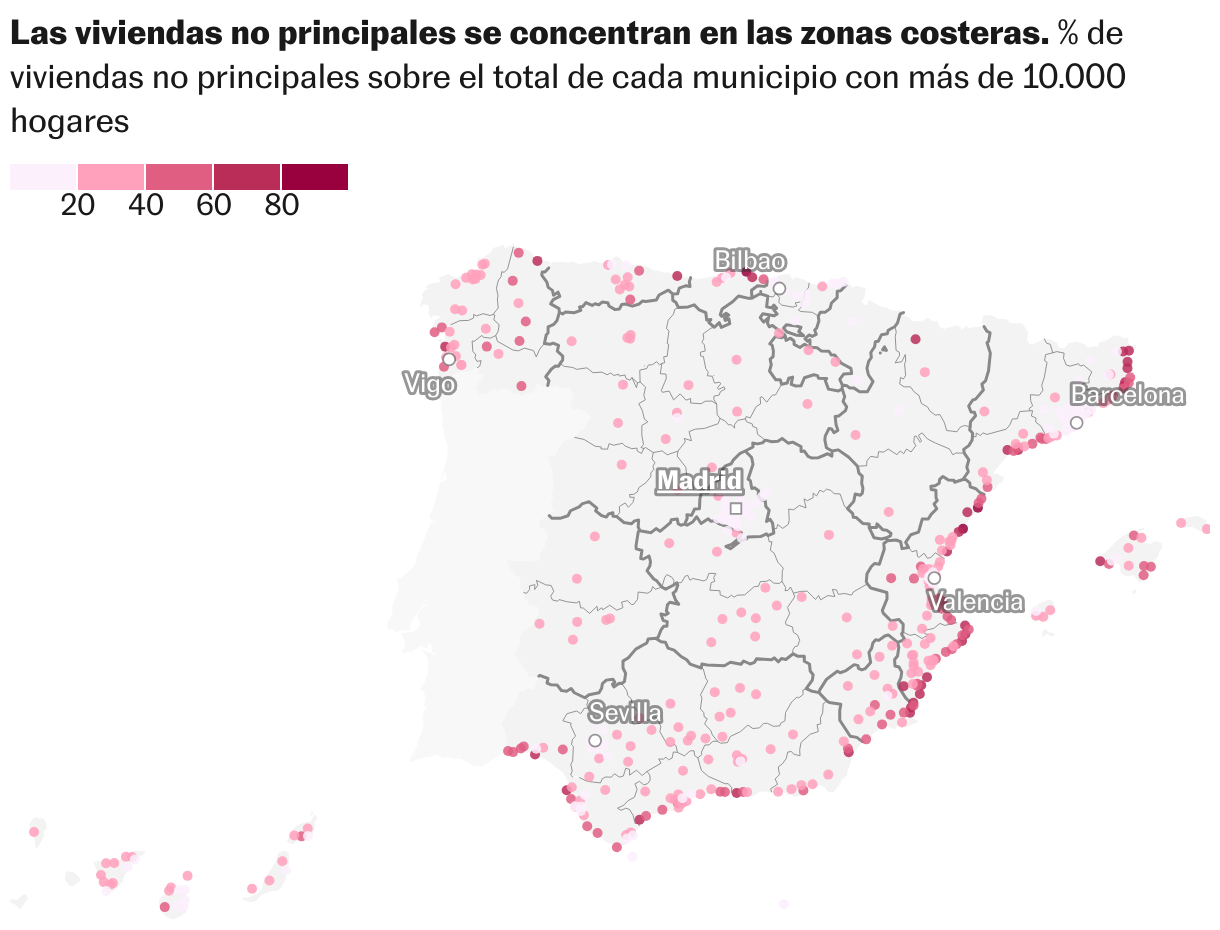Quienes llenan las zonas costeras en verano suelen vivir en el extranjero o en las grandes capitales de España, donde la vivienda no principal tiene una representación mucho menor, del 15% aproximadamente. También residen en las ciudades dormitorio que se levantaron en torno a ellas, donde el porcentaje es muchísimo más bajo, de entre el 5% y el 8%. Son núcleos como Coslada, Móstoles o Alcorcón (en Madrid) y Ripollet, Sant Andreu y todos los del área del Llobregat, en Barcelona. Lo mismo sucede en el cinturón industrial vasco, como Barakaldo, Basauri o Portugalete, y las que rodean a Valencia (Paterna o Catarroja) y Sevilla (Dos Hermanas o La Rinconada).