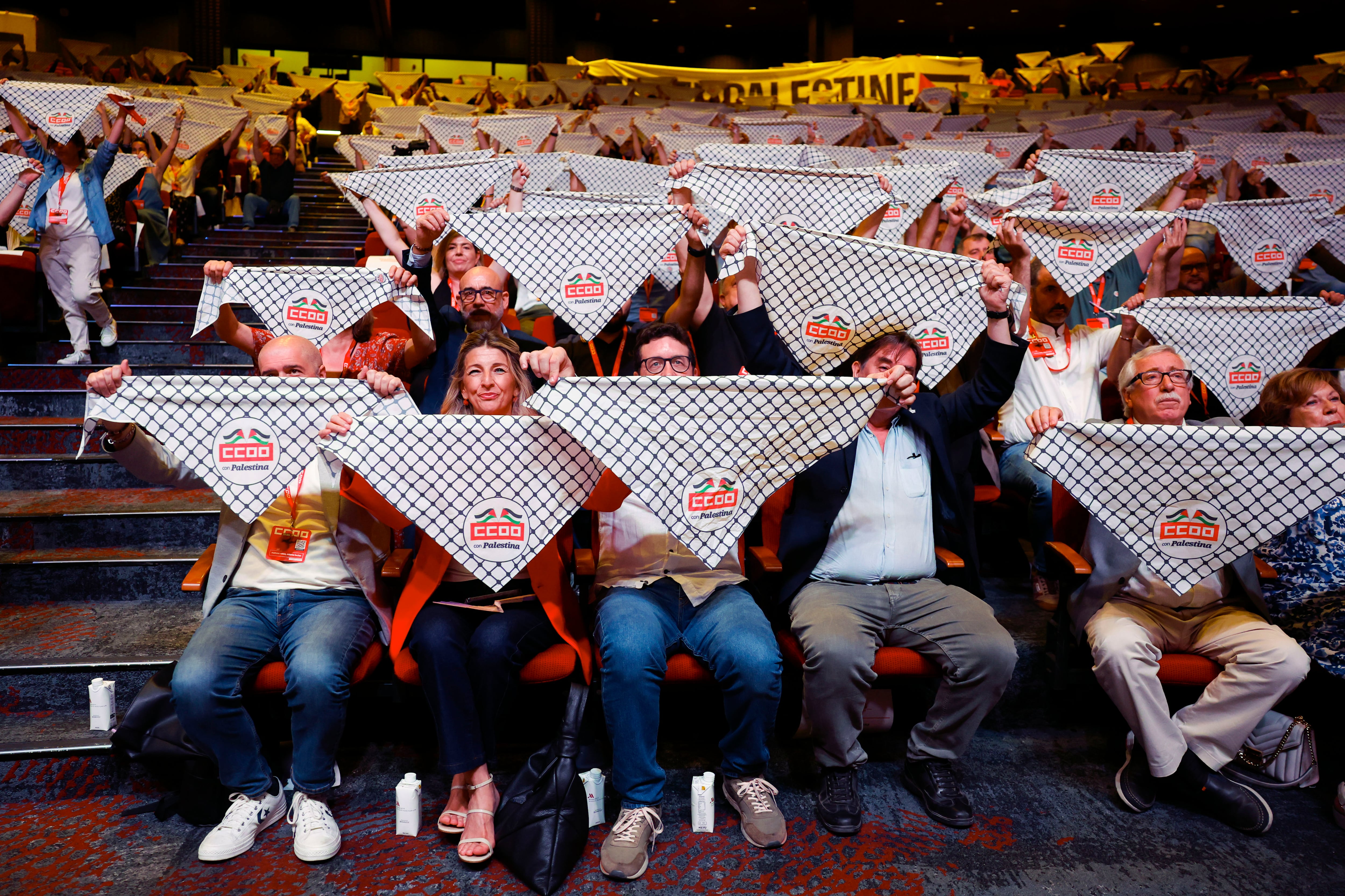 Tanto Álvarez como Sordo vienen priorizando la crítica a Israel y el apoyo a Palestina en sus discursos desde hace meses. Últimamente, inician cada rueda de prensa hablando de este asunto. En la protesta sindical frente al Congreso a favor de la reducción de jornada, que acabó descarrilando por la oposición de PP, Vox y Junts, había tantas banderas palestinas como carteles a favor de la contracción del tiempo de trabajo.