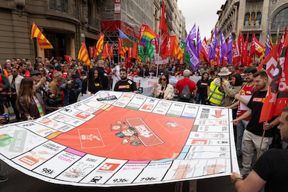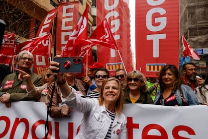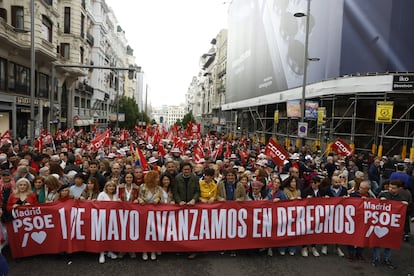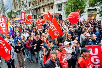 Miles de personas por toda España han celebrado este jueves el Primero de Mayo, Día Internacional de los Trabajadores. Repartidos por las manifestaciones que han tenido lugar en 80 ciudades, trabajadores y sindicalistas han realizado una furibunda defensa de los derechos laborales, que sienten amenazados por el auge de la extrema derecha en Europa, y todavía más tras el regreso de Donald Trump a la presidencia de los Estados Unidos. “Hay que poner pie en pared”, ha reclamado Pepe Álvarez, líder de UGT, en alusión a los “movimientos reaccionarios” que están reproduciéndose a nivel mundial. “Estamos ante el momento más crítico para los trabajadores desde la Segunda Guerra Mundial”, ha complementado Unai Sordo, secretario general de CC OO. El recorte de la jornada laboral, que será aprobado en el próximo Consejo de Ministros, y deberá someterse después al escrutinio parlamentario, ha sido otra de las reivindicaciones principales en la marcha principal que se ha celebrado en Madrid, algo descafeinada. Mientras los organizadores han calculado la presencia de 50.000 personas, la delegación del Gobierno en la capital la ha rebajado hasta los 12.000. Una cifra que muchos de los asistentes también consideran exagerada.