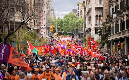 Miles de personas han marchado también este jueves en Barcelona, donde los ejes centrales de la movilización han sido la defensa de la paz, las pensiones, la mejora de las condiciones salariales, y la lucha contra el auge de la extrema derecha. Además, los manifestantes han exhibido pancartas en contra del expediente de regulación de empleo del Grupo Freixenet —presentado por la compañía recientemente y que afectaría a un 24% de la plantilla—, y a favor de la bajada de los precios del alquiler, uno de los problemas principales que afectan actualmente a los ciudadanos.