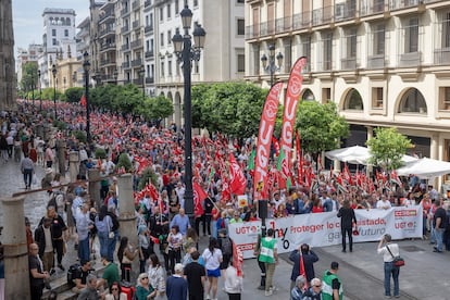 Pese a que en términos interanuales el desempleo ha bajado en Andalucía (60.900 parados menos respecto al primer trimestre del año pasado), la tasa de empleo juvenil sigue siendo de las más altas de España (34,4%, según la EPA del primer trimestre de 2025, la segunda peor, detrás de Extremadura). Por eso Sofía, enfermera de 23 años, y María, actriz de 24, se sorprendían de la escasa presencia de personas de su edad en la manifestación. “Nosotras somos gallegas, aunque vivimos aquí; y allí hay mucha concienciación por parte de la gente de nuestra edad y notamos mucha diferencia”, cuenta María para la que manifestarse es “una manera de comunicar de manera tangible que merecemos derechos, calidad en el trabajo y descanso”.