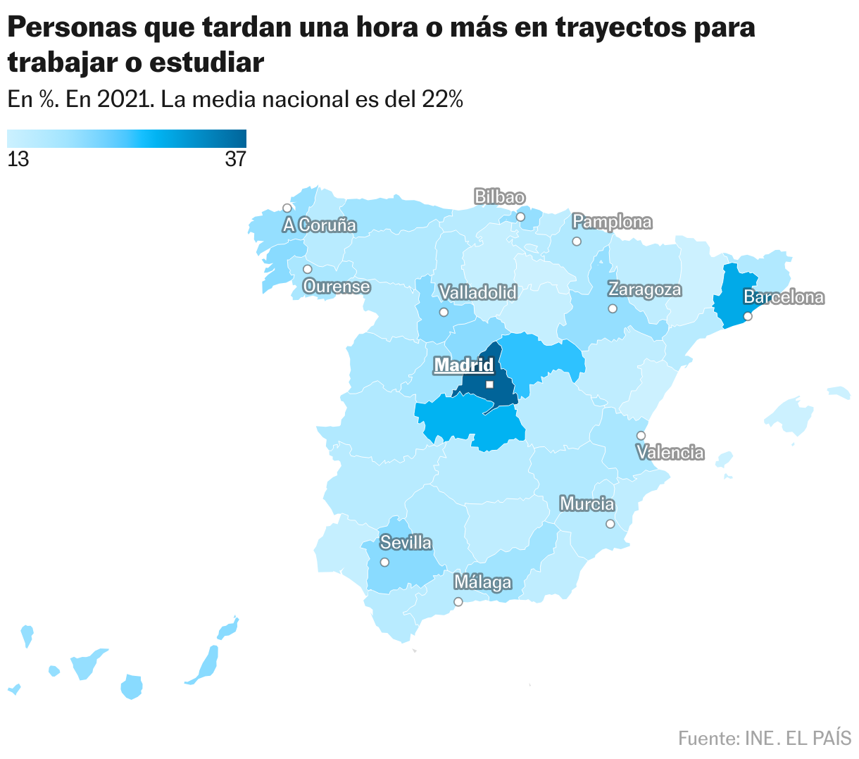 Lahera advierte de que la pujanza económica de Madrid tiene externalidades negativas que, en su opinión, las administraciones deberían intentar atenuar. “Madrid, al consolidarse como una ciudad global tan fuerte, atrae a mucha gente. Esto impulsa el precio de la vivienda y mete presión a la infraestructuras. Cada vez tienes que vivir más lejos y el transporte público para llegar a tu puesto, si no se adapta, cada vez va más lleno”, comenta el profesor de la Universidad Complutense. Madrid es la autonomía en la que más personas dedican más de una hora en sus desplazamiento laborales. Son el 37%, con las vecinas Toledo (28%) y Guadalajara (26%) también en proporciones muy superiores a la media (22%).