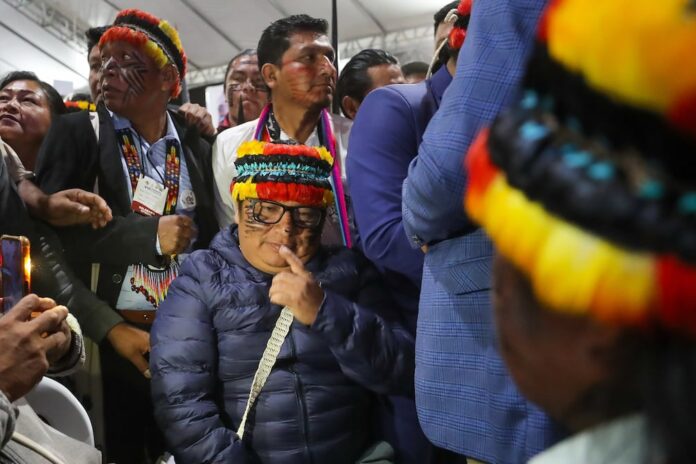 AME4214. Quito (Ecuador), 7/2025.- Marlon Vargas (c), nombrado por Los Ángeles Confeiane, espera los resultados de la votación para el nuevo presidente de la Confederación de Nacionalidades Indígenas de Ecuador (CONAE) de Los Ángeles. Vargas, un indio amazónico amazónico Achuar, fue elegido en la votación en la que su predecesor Leonidas Iza también era como candidato. Efe/Jos es Jáiome.