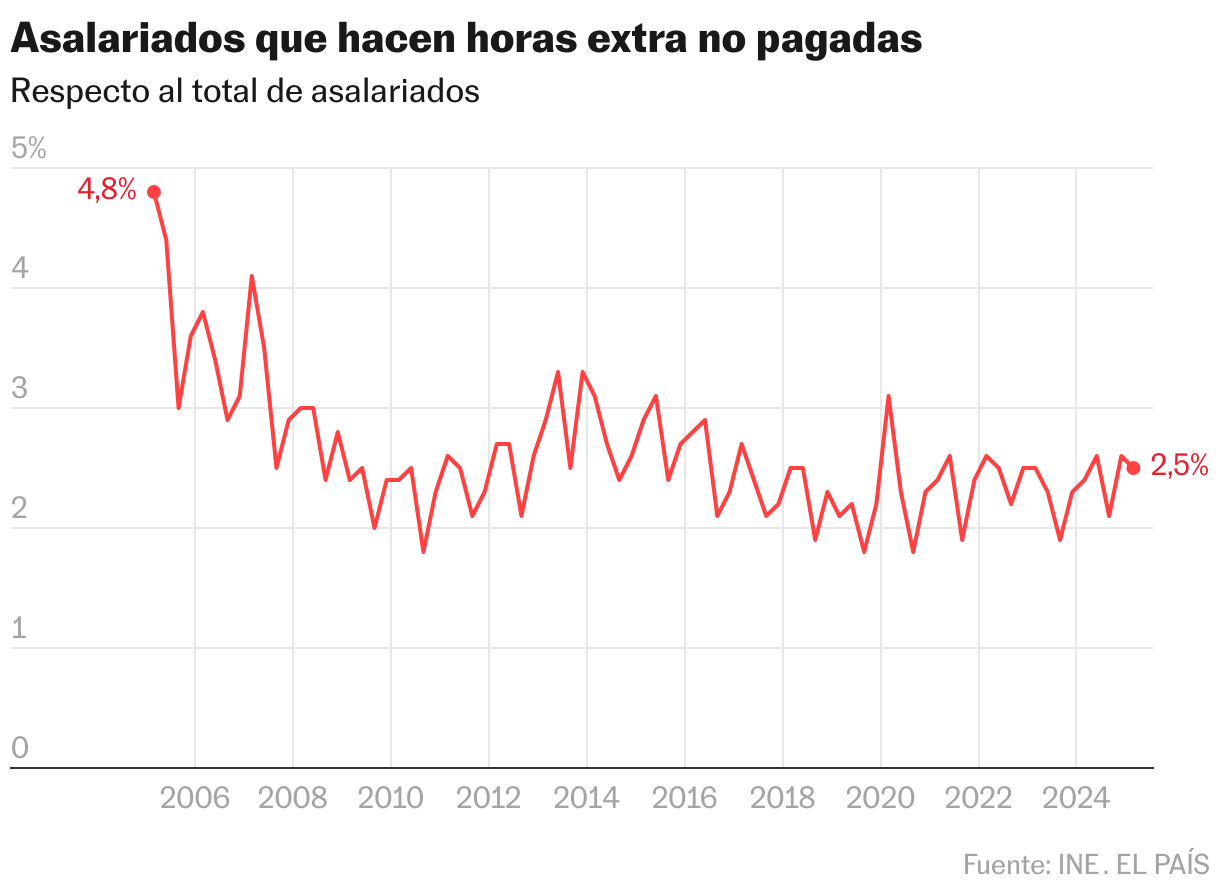 Estas cifras absolutas se ven condicionadas por la evolución del número de ocupados, que en los últimos años crece con fuerza. Por ello también es importante relacionar esta cifra con el total de asalariados: con ese parámetro, el 2,5% de los asalariados hicieron horas extra no pagadas en España en el primer trimestre, una décima más que un año antes y exactamente la misma proporción que en 2023.
